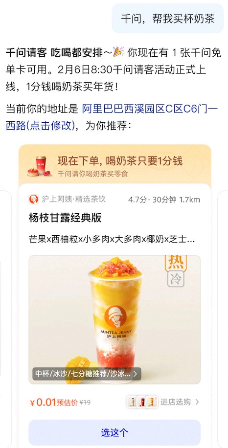 千问APP启动30亿免单:AI一句话免费点奶茶 每人可领525元免单卡