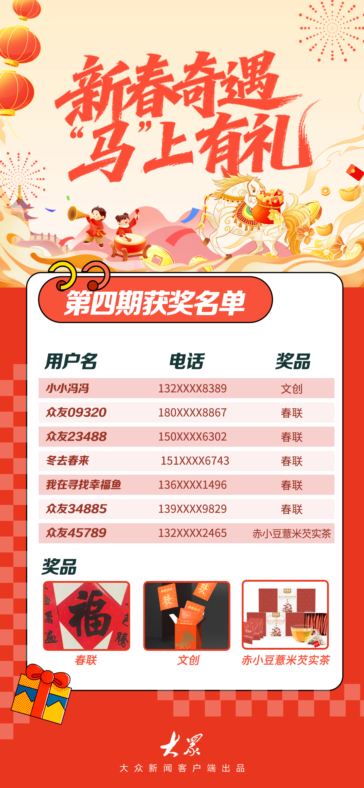 2月8日,大众新闻客户端“新春奇遇”评论有奖活动第四期名单正式公布。温馨提示:每日阅读标有“新春奇遇记”的文章,在评论区畅所欲言、分享观点,留下10字以上评论,就有机会赢取大众新闻定制的新春专属礼品!点击即可一键直达今日文章:新春奇遇记|当世界“种草”中国年,全球购物车都买了啥?相关链接:新春奇遇,“马”上有礼