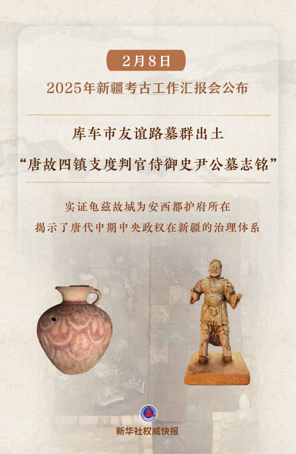 2月8日在京举行的2025年新疆考古工作汇报会上,公布了库车市友谊路墓群等“实证历代中央政权有效管辖治理新疆”考古新发现。详情>>