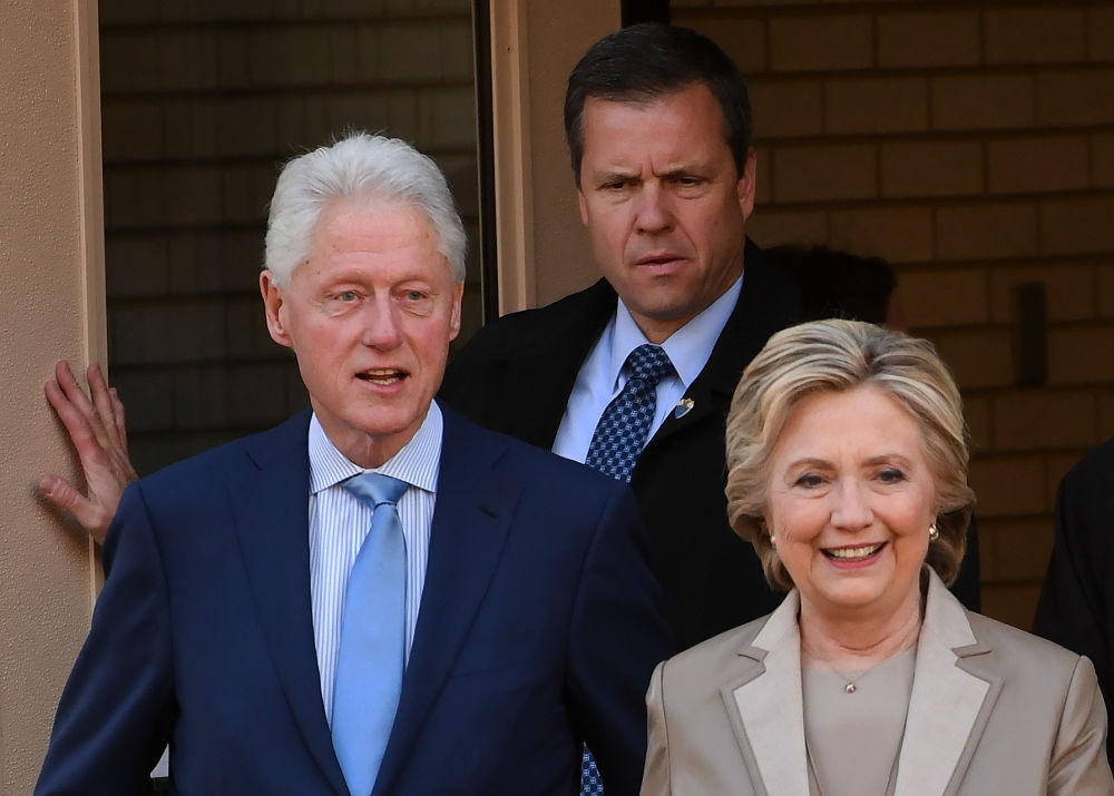 2016年11月8日,在美国纽约州查帕阔一处投票站,民主党总统候选人希拉里·克林顿(前右)与她的丈夫、前总统比尔·克林顿(前左)参加大选投票。新华社记者 殷博古 摄