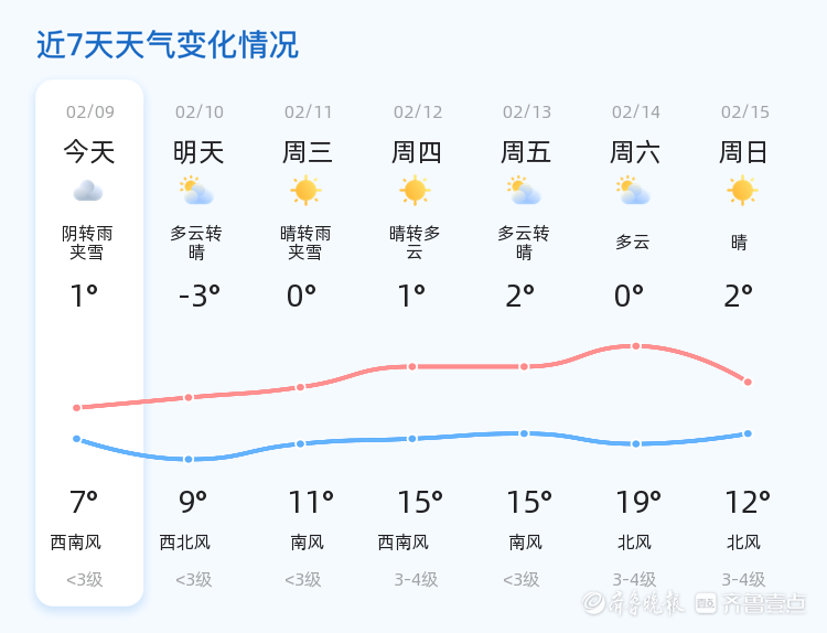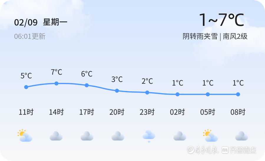 今日是2026年2月9日,农历十二月廿二,星期一。淄博市今日天气为阴转雨夹雪,气温介于1℃至7℃之间。各区县普遍出现阴转雨夹雪天气,温度变化不大,湿度为52%,空气质量良好。