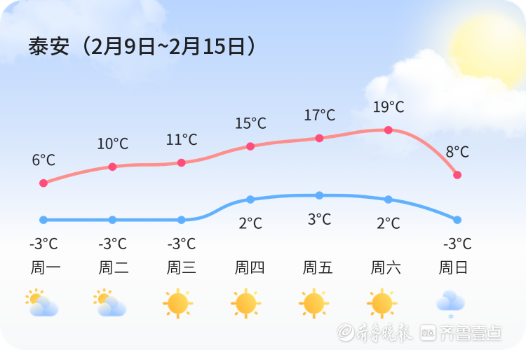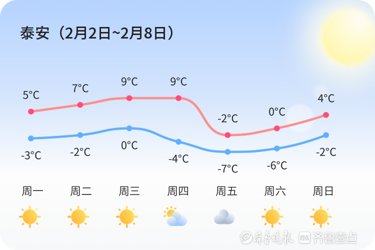 全市周平均最高温4℃,平均最低温-3℃,平均气温0℃,周最高气温9℃,出现在周三、周四,周最低温-7℃,出现在周五。