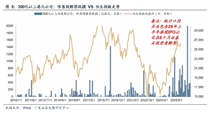 广发证券指出,在2026年的3月以及9月,可能会有新一轮市值300亿港元以上的中大型规模公司的限售股解禁潮。