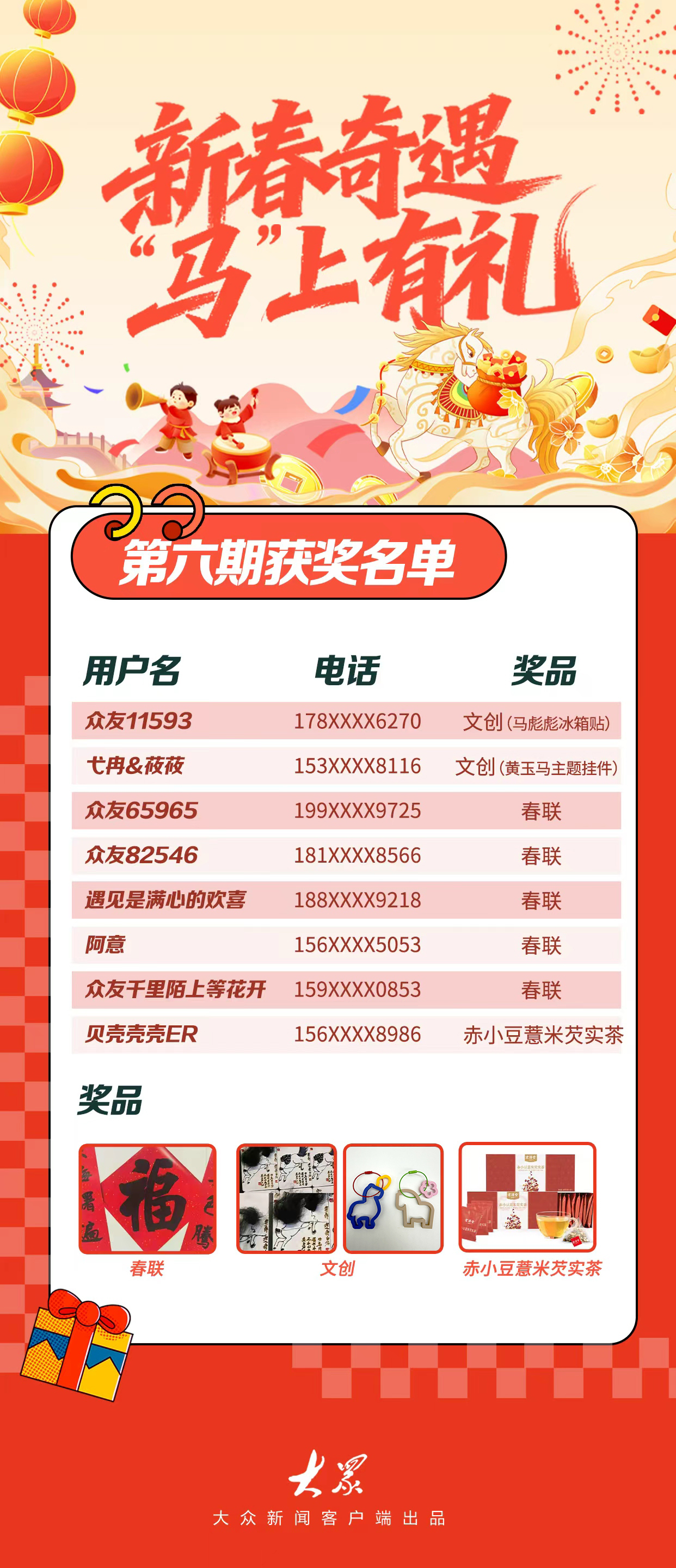 2月10日,大众新闻客户端“新春奇遇”评论有奖活动第六期名单正式公布。 温馨提示:每日阅读标有“新春奇遇记”的文章,在评论区畅所欲言、分享观点,留下10字以上评论,就有机会赢取大众新闻定制的新春专属礼品!点击即可一键直达今日文章:新春奇遇记|乐享山东!解锁“买买买”的幸福感,过个丰盛中国年 相关链接:新春奇遇,“马”上有礼
