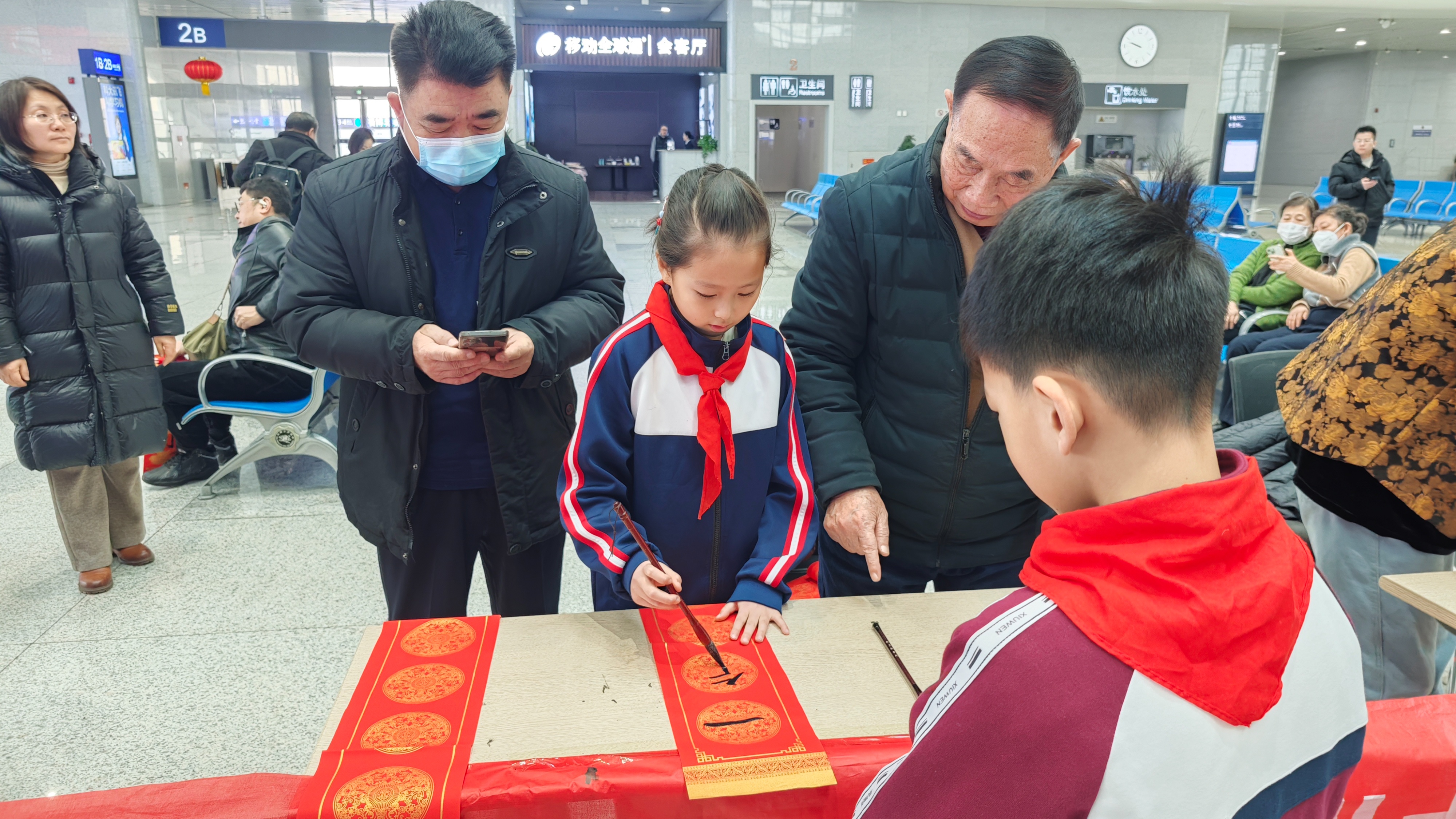 在互动体验区,书法家们现场挥毫,笔走龙蛇,一副副寓意吉祥的春联、一个个饱满生动的“福”字跃然纸上,为旅客送上新春的美好祝愿。不少旅客驻足排队,满怀期待地领取这份独具文化温度的新年礼物,带着浓浓的祝福踏上回家团圆的路。