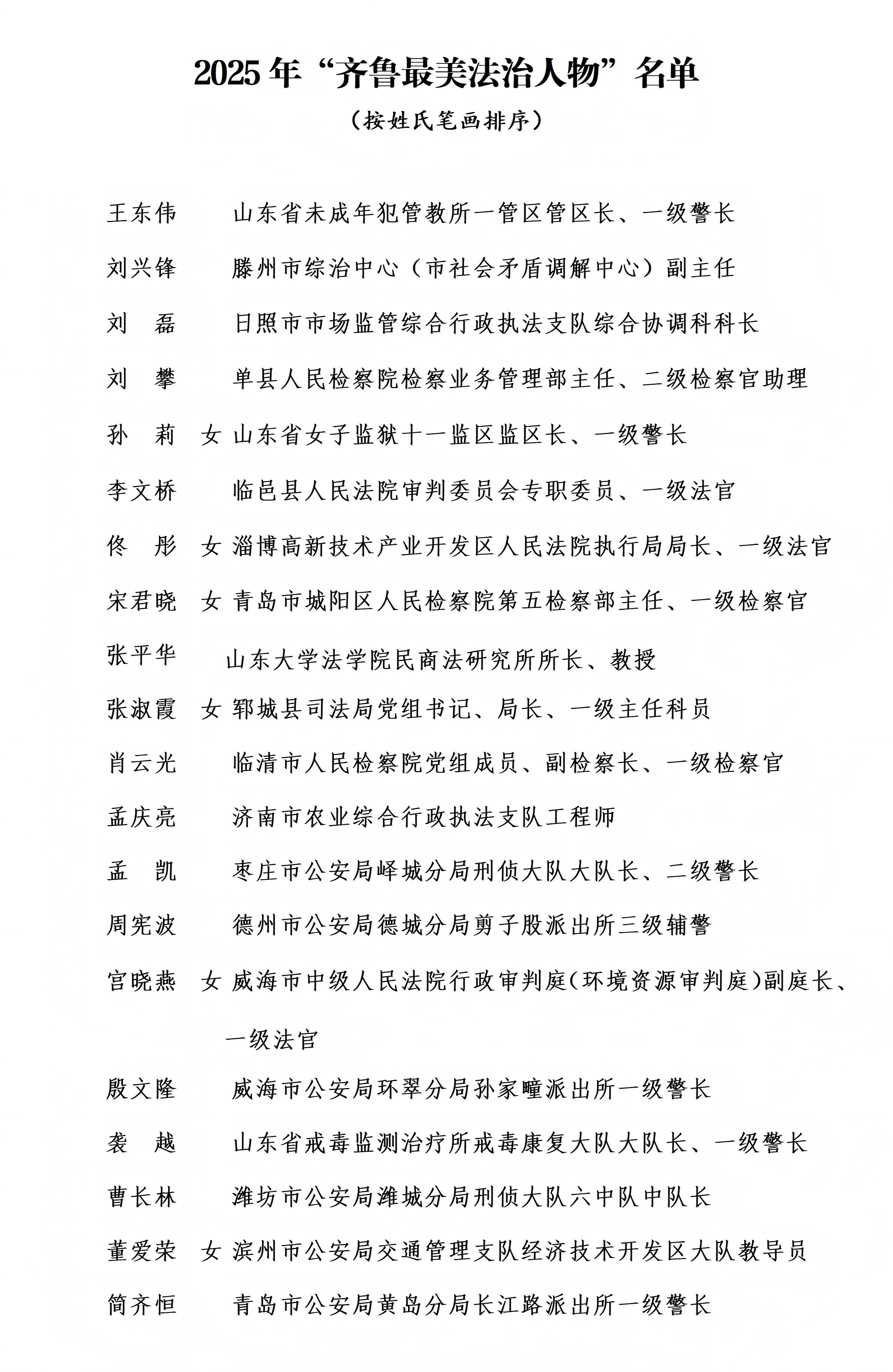记者2月10日获悉,为充分发挥典型的示范引领作用,激励山东省法治工作者坚守法治初心、勇担时代使命,省委宣传部、省委政法委、省委依法治省办联合组织开展了“齐鲁最美法治人物”宣传选树活动。经过层层发动、逐级推荐、严格审查和专家评审等环节,最终评选出20位“齐鲁最美法治人物”。(大众新闻记者张依盟)