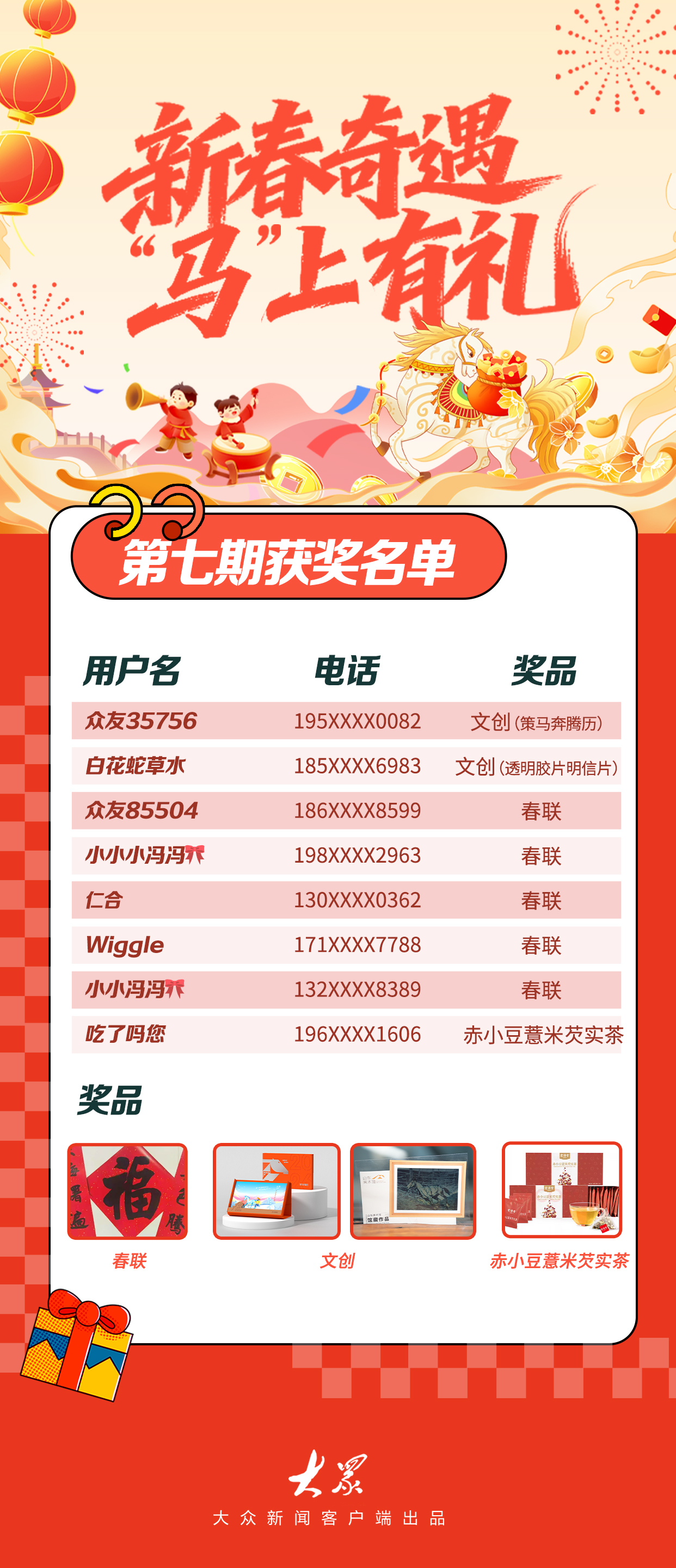 2月11日,大众新闻客户端“新春奇遇”评论有奖活动第七期名单正式公布。温馨提示:每日阅读标有“新春奇遇记”的文章,在评论区畅所欲言、分享观点,留下10字以上评论,就有机会赢取大众新闻定制的新春专属礼品!点击即可一键直达今日文章:新春奇遇记|全球掀起“过年热”,这次主打“养生局”相关链接:新春奇遇,“马”上有礼