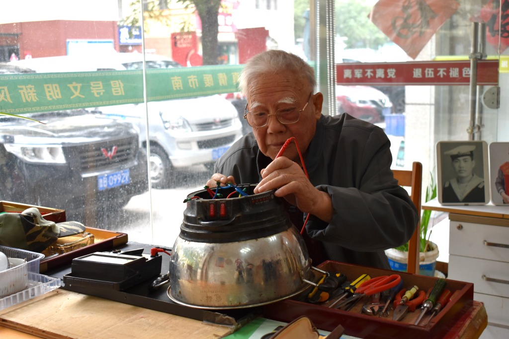 1968年转业后,他担任单位电工班班长,工作兢兢业业,下班后仍挎起工具包走街串巷,为乡亲们维修家电和生产设施,始终“白干”不谈钱。1975年,他勇挑重担攻克进口T68镗床维修难题,婉拒厂家重金酬谢,只珍藏锦旗,用“我是党员,是老兵,哪能图钱”的话语,彰显老党员本色。退休后,他将服务阵地转移到社区,65年间工具包换了又换,修过的电器不计其数,无偿服务的承诺从未改变。