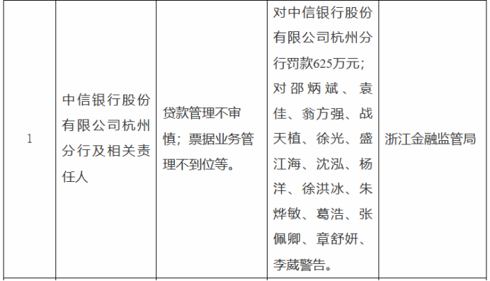 2月6日,国家金融监督管理总局浙江监管局官网公示的行政处罚决定书显示,中信银行股份有限公司杭州分行因违法违规被“双罚”。其中,中信银行股份有限公司杭州分行因贷款管理不审慎、票据业务管理不到位等被罚款625万元,邵炳斌、袁佳、翁方强、战天植、徐光、盛江海、沈泓、杨洋、徐洪冰、朱烨敏、葛浩、张佩卿、章舒妍、李葳被警告。