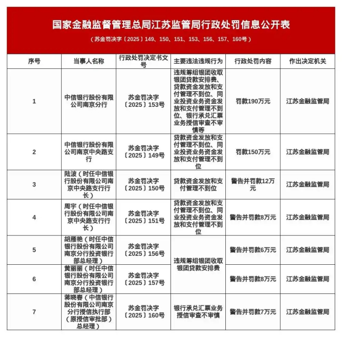 中信银行股份有限公司南京中央路支行因贷款资金发放和支付管理不到位、同业投资业务资金发放和支付管理不到位被罚款150万元。时任中信银行股份有限公司南京中央路支行行长的陆波和周宇,分别被警告并罚款12万元和8万元。