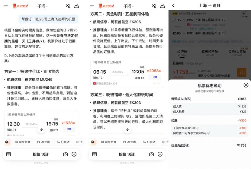 例如,用户对千问APP说,“帮我订一张25号上海飞迪拜的机票。”千问APP即刻推荐了MU245、EK305、EK303三个航班,点击对应商品卡片,三张机票均显示“千问专享”,立减金额100元到300元不等,点击卡片即可进入确认及支付环节。