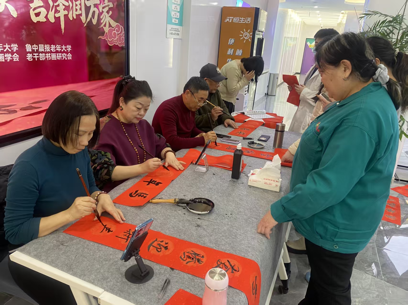 年味渐浓,春意渐暖,家家户户都在盼着过个团圆吉祥年。鲁中晨报老年大学书法班的高妹英、董兰珂、谭延玉、刘红玉等几位学员带头,拉着班里的伙伴们走进社区、医院、银行等企事业单位,用写春联、送福字的方式,把满满的新春祝福送到大家身边。