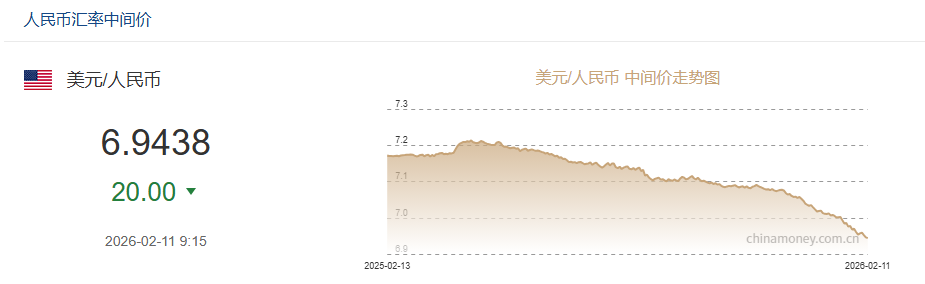 临近年关,人民币延续去年年末以来的升值走势。中国人民银行授权中国外汇交易中心公布,2月11日,人民币兑美元中间价报6.9438,上调20点,创2023年5月11日以来新高。2月11日,人民币兑美元即期收盘价报6.9115。