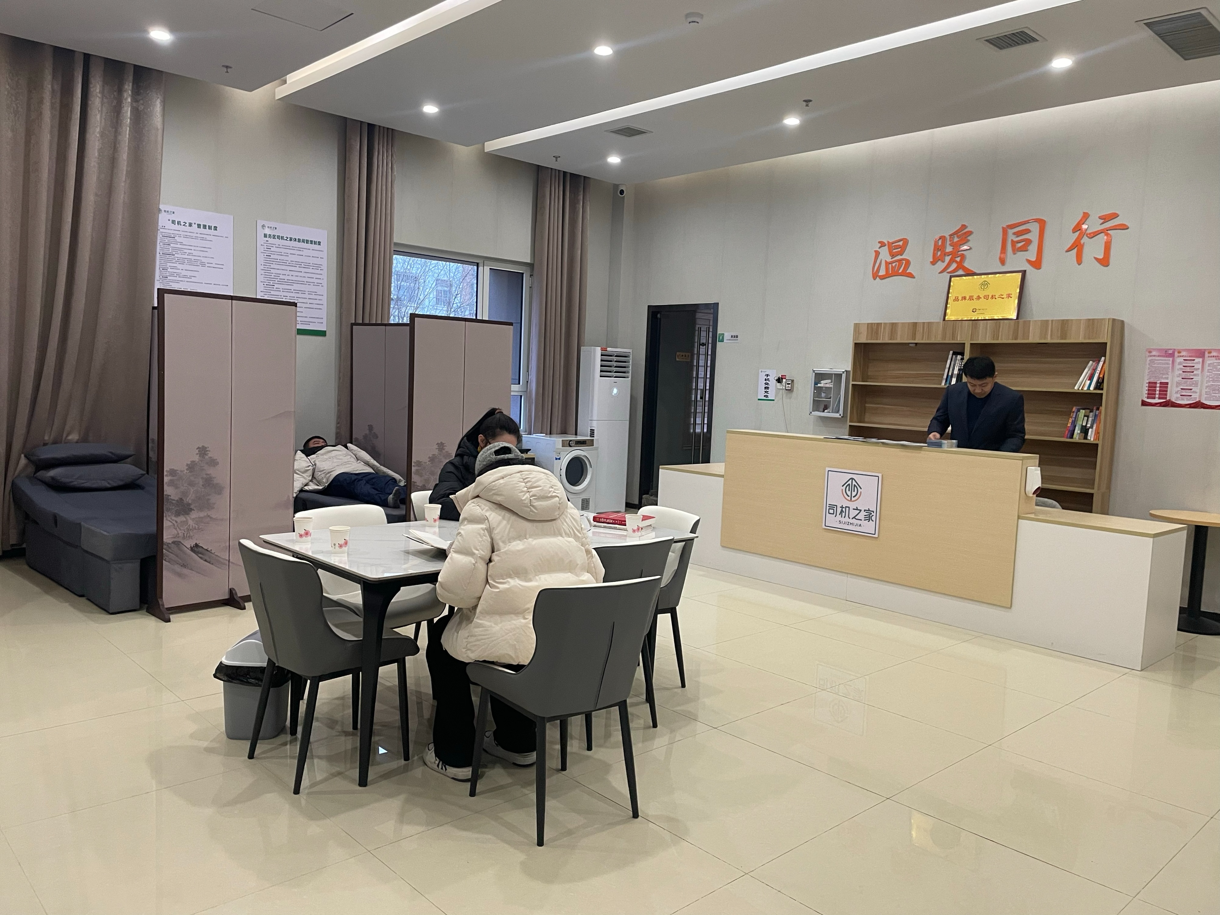 与此同时,陕J牌照的谢师傅也刚停靠服务区。他从陕西榆林出发,跑了十多个小时,目的地是临沂。“以前听同行说山东服务区条件好,今天一见,果然名不虚传。”谢师傅推开“司机之家”休息室的门,暖气迎面而来。“冬天开车,能找个地方吃上一口热乎饭,喝上一口热乎茶,再好不过了,天天吃泡面,早就吃腻啦!”他边喝茶边说,春节前是他最忙的时候,已经连着十几天没好好休息了。