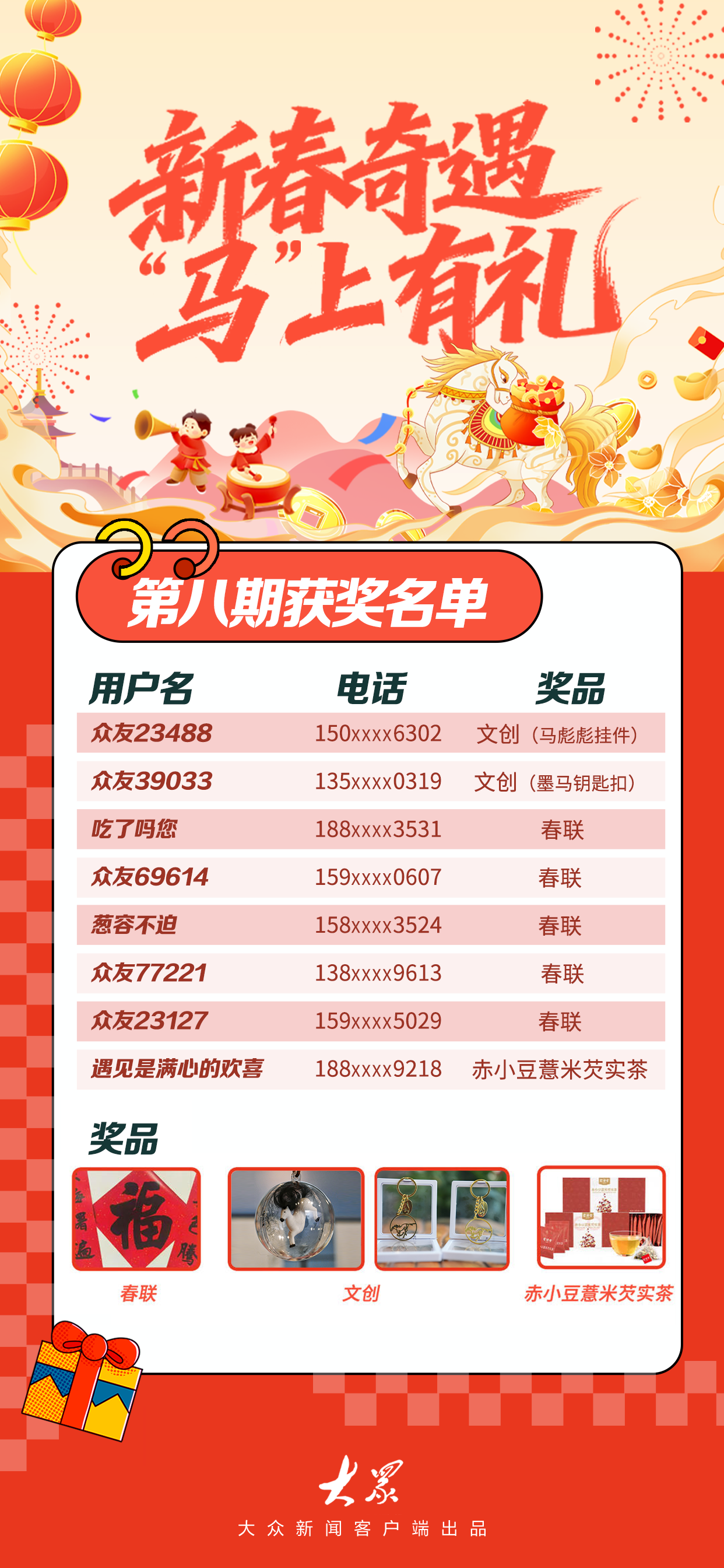 2月12日,大众新闻客户端“新春奇遇”评论有奖活动第八期名单正式公布。温馨提示:每日阅读标有“新春奇遇记”的文章,在评论区畅所欲言、分享观点,留下10字以上评论,就有机会赢取大众新闻定制的新春专属礼品!点击即可一键直达今日文章:新春奇遇记|最长春节假期来了,你会选择“反向过年”吗?相关链接:新春奇遇,“马”上有礼