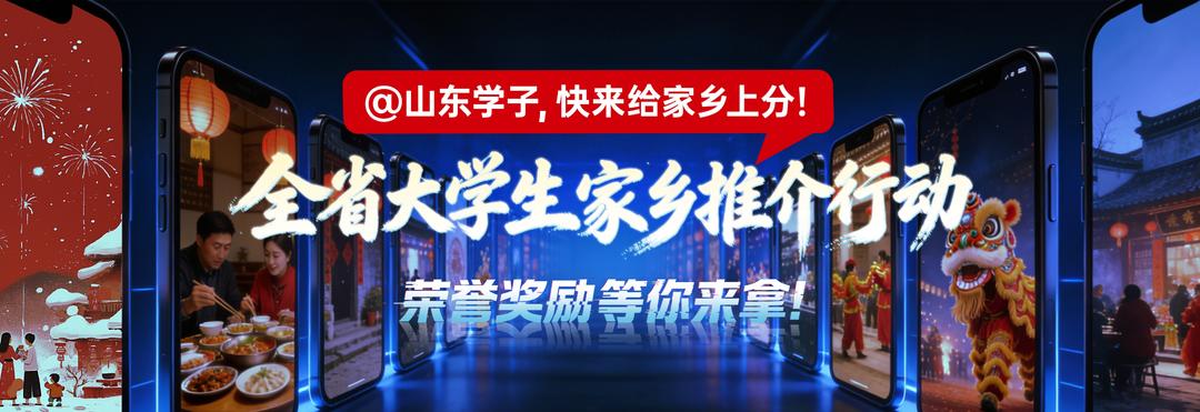 齐鲁大地,文脉绵长;家国情怀,青春激扬。作为新时代的“齐鲁后浪”,大学生是家乡文化的“活态传承人”,更是新时代故事的“青春解码者”。大众新媒体大平台策划启动“山东学子,快来给家乡上分!”全省大学生家乡推介行动,诚邀全省大学生以镜头为笔、以文字为墨,描绘你眼中最鲜活、最厚重、最温暖的家乡画卷!