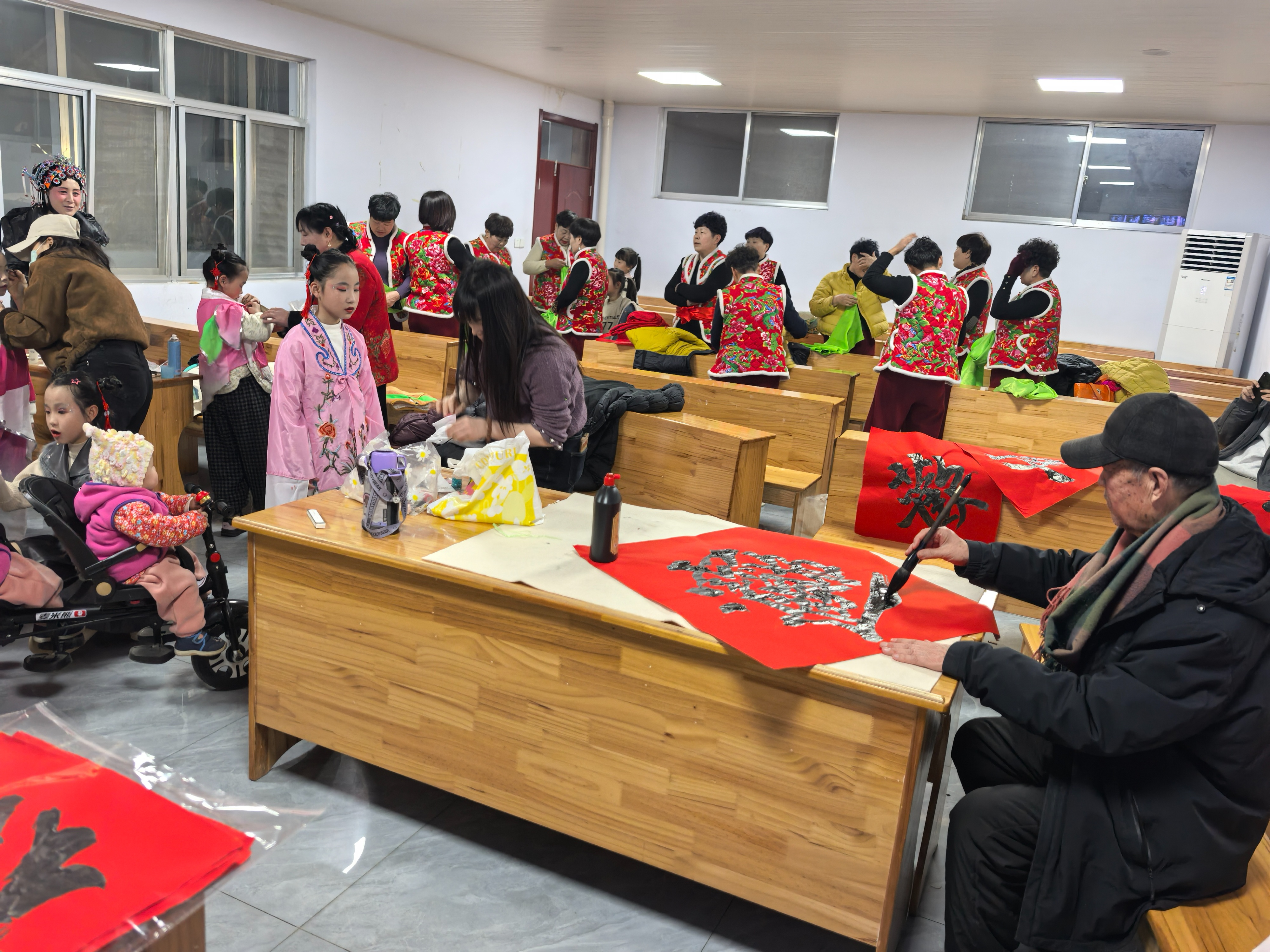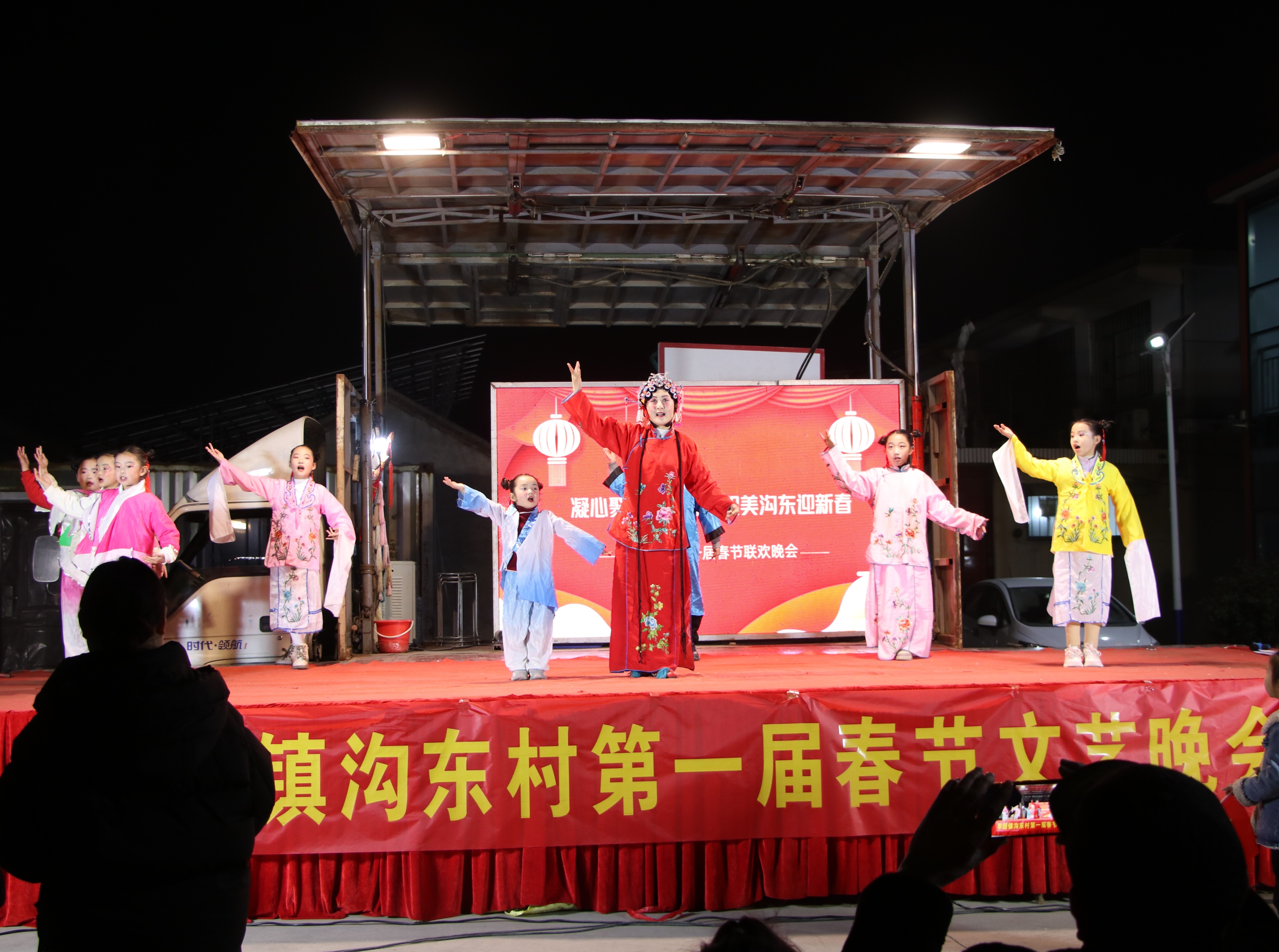 随着夜色渐深,村晚落幕。文化广场边,孩童嬉戏模仿水袖身段;农家门楣上,“福”字与弦子戏宣传画相映成趣,沟东村的年味在村晚的热闹与忙碌中,已越来越浓。