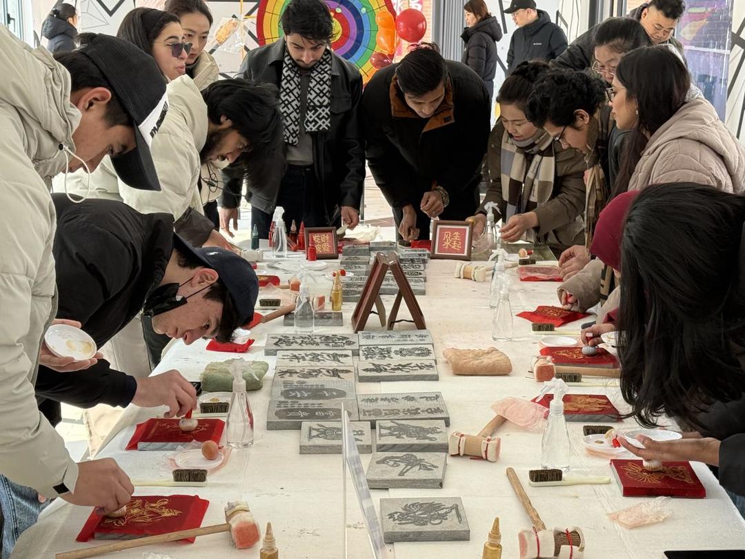 文化街区深体验。2月7日,青年教师化身“文化向导”,带领来自多国的20余名留学生深入德城区杨家圈文化街区,参观非遗展厅、体验拓印技艺。在拓印体验区,留学生们拿起棕刷,在非遗代表性传承人的指导下,亲手制作出带有吉祥纹样的拓片。“原来这就是中国的传统技艺,太神奇了!”阿尔及利亚留学生萨米说,“我要把这个拓片带回去,告诉我的家人中国文化有多棒。”通过精心设计的沉浸式体验,留学生们跳出了“走马观花”的固有模式,在红灯笼高悬、年味氤氲的街巷中,驻足欣赏民俗表演,用镜头记录真实生动的“中国年”景象,并通过社交平台实时分享至海外,找准了感知中国文化的叙事切口。