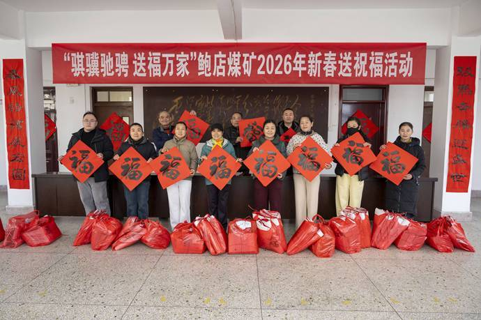 这是鲍店煤矿延续四十载的“迎新春翰墨送祝福”传统。2026年,该矿织书法爱好者潜心创作,将饱含新春祝福、安全期盼的12000余幅春联、福字,送到全矿各单位和职工家庭。红灯笼挂起,灯带点亮,年货发放现场笑语盈盈,“志愿红”穿梭楼宇来到困难职工家中……矿山年味渐浓,暖意从组织流向末梢,直抵人心。