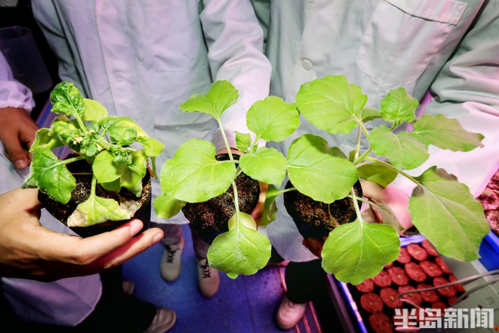 团队在作为模式植物的烟草植株上进行实验。(左一为病毒感染植株,左二为接种疫苗抗病毒植株,左三为健康植株)