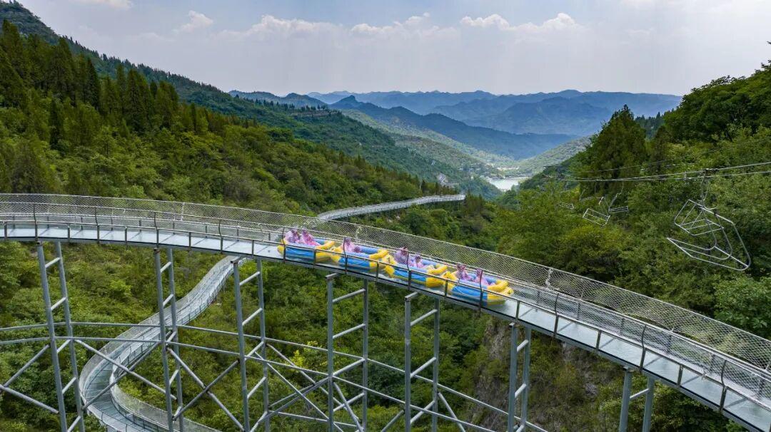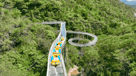 作为景区主推的王牌项目,玻璃漂流如一条晶莹剔透的巨龙盘旋在山谷之间。