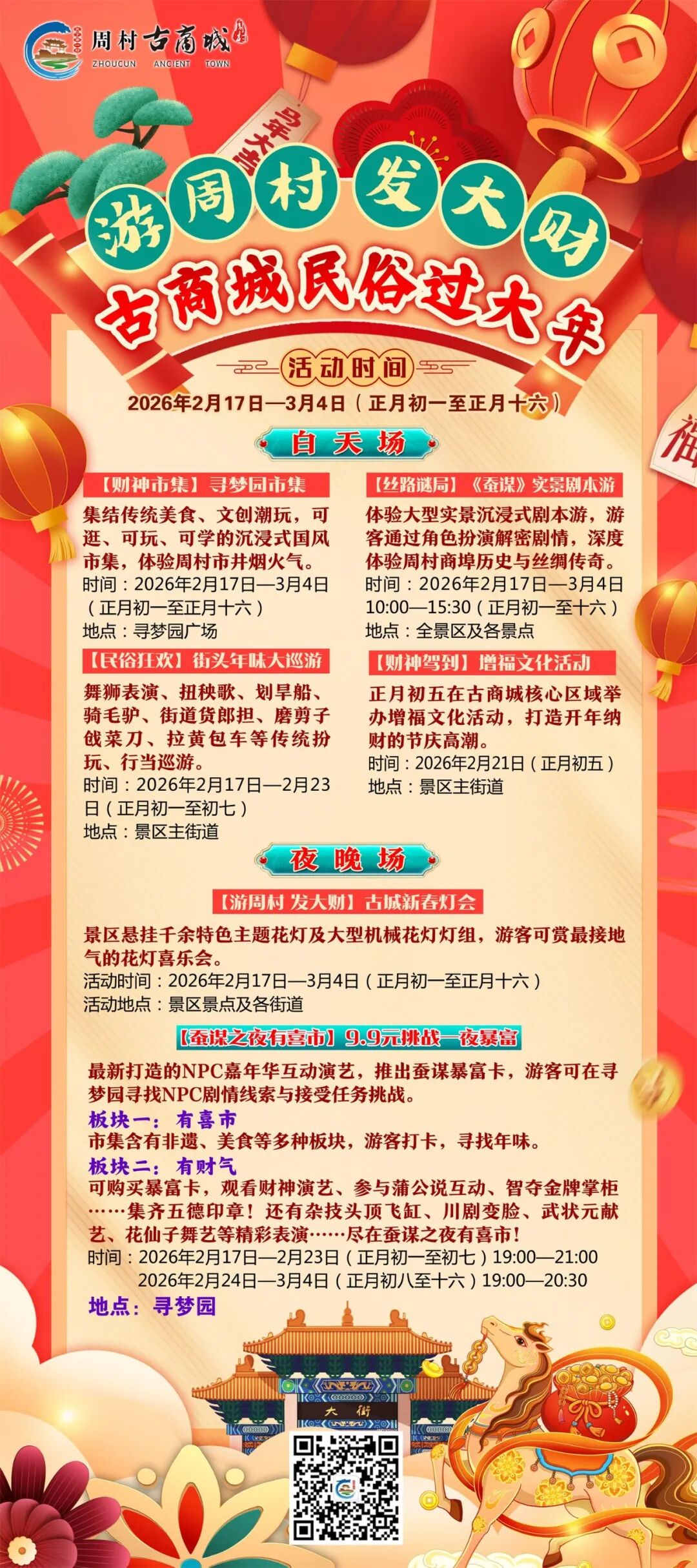 2026年2月17日至3月4日(正月初一至十六),周村古商城 “游周村发大财|古商城民俗过大年”为你呈现一个有仪式感、有参与感、有记忆点的新年。