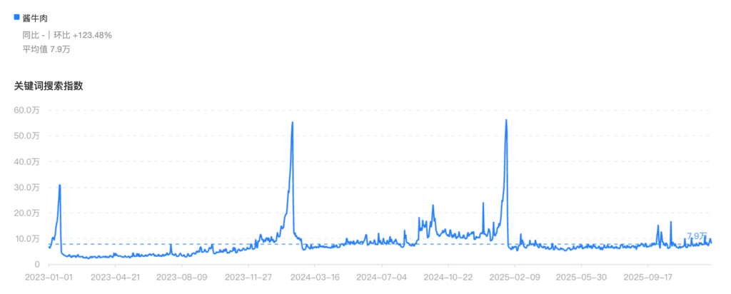 比如在社交平台上就可以看到,过去3年里,临近除夕夜的前几日,酱牛肉这道菜的搜索指数就极速上升,是平日里搜索量的7.6倍。