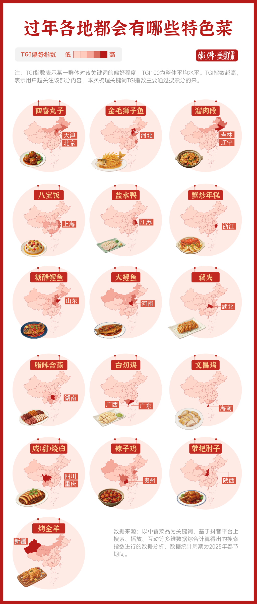 为了找到各省份的特色年夜饭,我们引入TGI偏好指数(Target Group Index),即用各地区用户在春节期间对各菜品的搜索偏好度相对于全国用户整体搜索偏好度的统计,来分析各地都有哪些特色年夜饭。