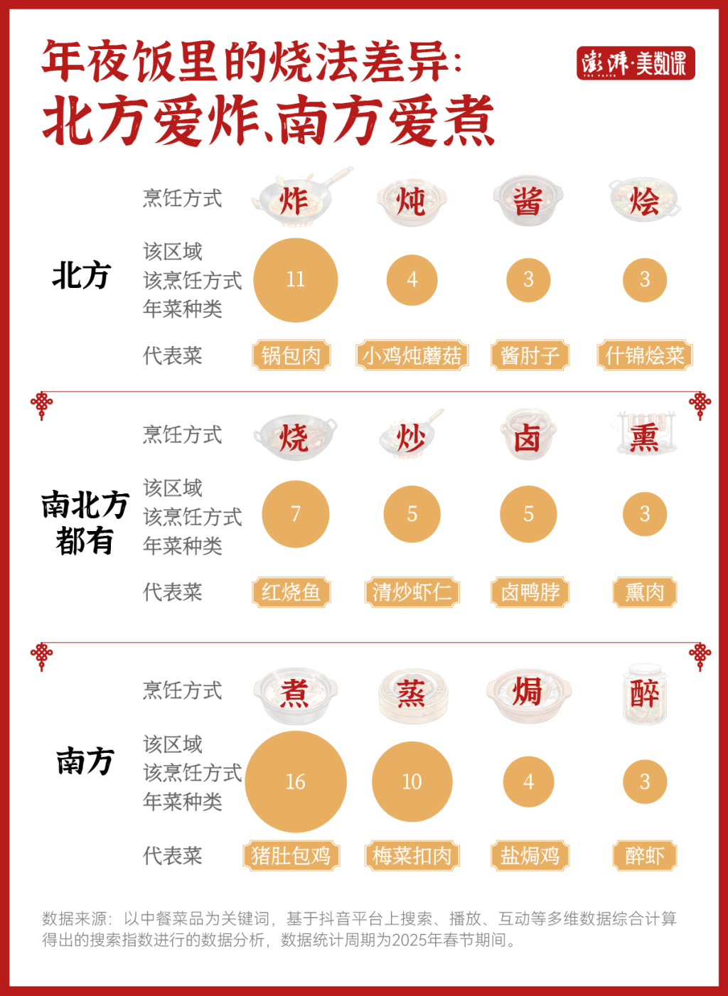 除了食材上的偏好,各地烹饪方式上的偏好,也深刻影响着各地年夜饭的代表菜。