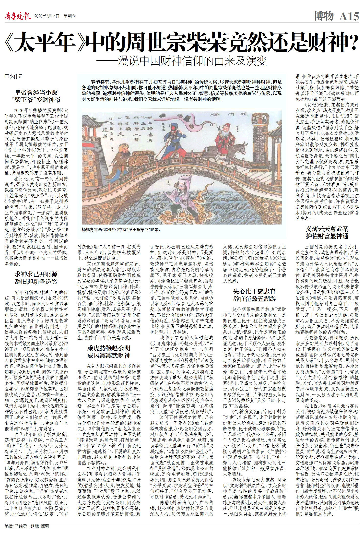 在河北、河南一带的民间传说里,柴荣未发迹时曾游历四方,以推车卖伞为生,深知民间疾苦,百姓尊称为“柴王爷”。河北民歌《小放牛》里,有一句关于赵州桥的唱词:“张果老骑驴桥上走,柴王爷推车就轧了一道沟”,显得很接地气。可能由于传说中的这段商贩经历,加之“柴”“财”发音相近,北方部分地区将“柴王爷”作为财神崇拜。其实,民间信仰体系里的财神并不是某一位固定的神,敬拜对象往往因时、因地而异,可以组合成一个庞大的群体,但柴荣大概是其中唯一一位当过皇帝的。