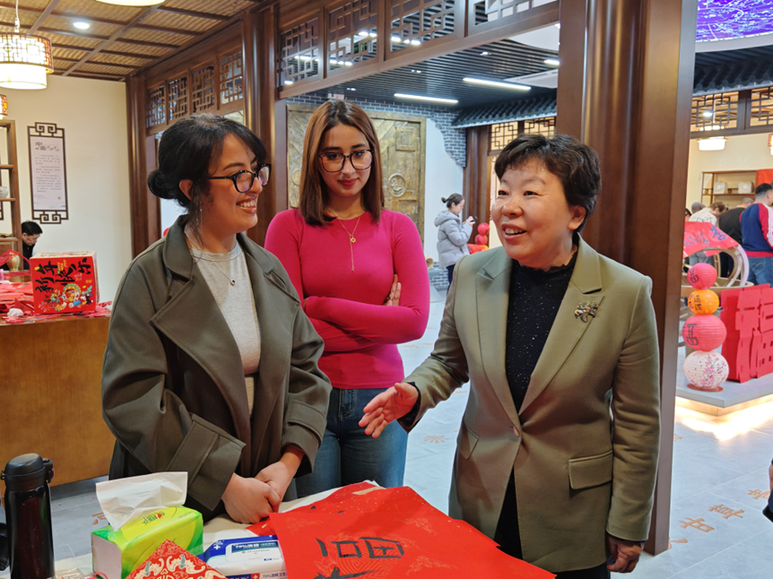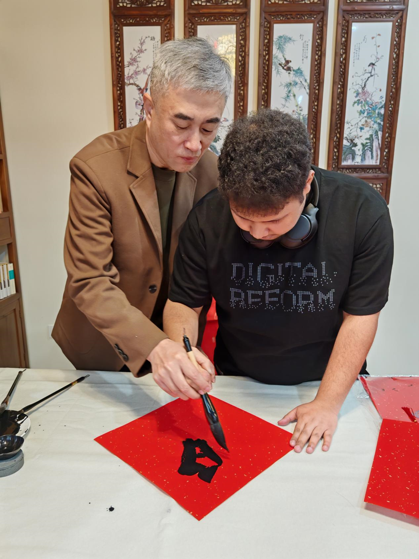 与此同时,春联区正上演着一番“墨韵凝情”的景致。在书法老师的指导下,留学生手握毛笔,饱蘸浓墨,在红纸上认真临摹。