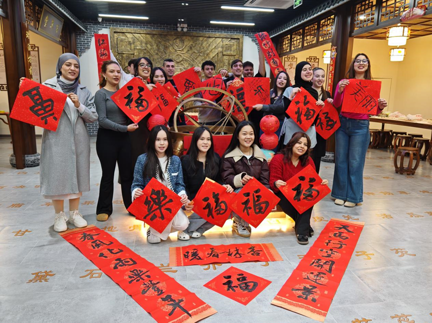 红纸黑字,笔墨晕染间,一个个形态各异的“福”字和一副副寓意吉祥的春联,寄托着留学生们对新年和美好生活的憧憬。