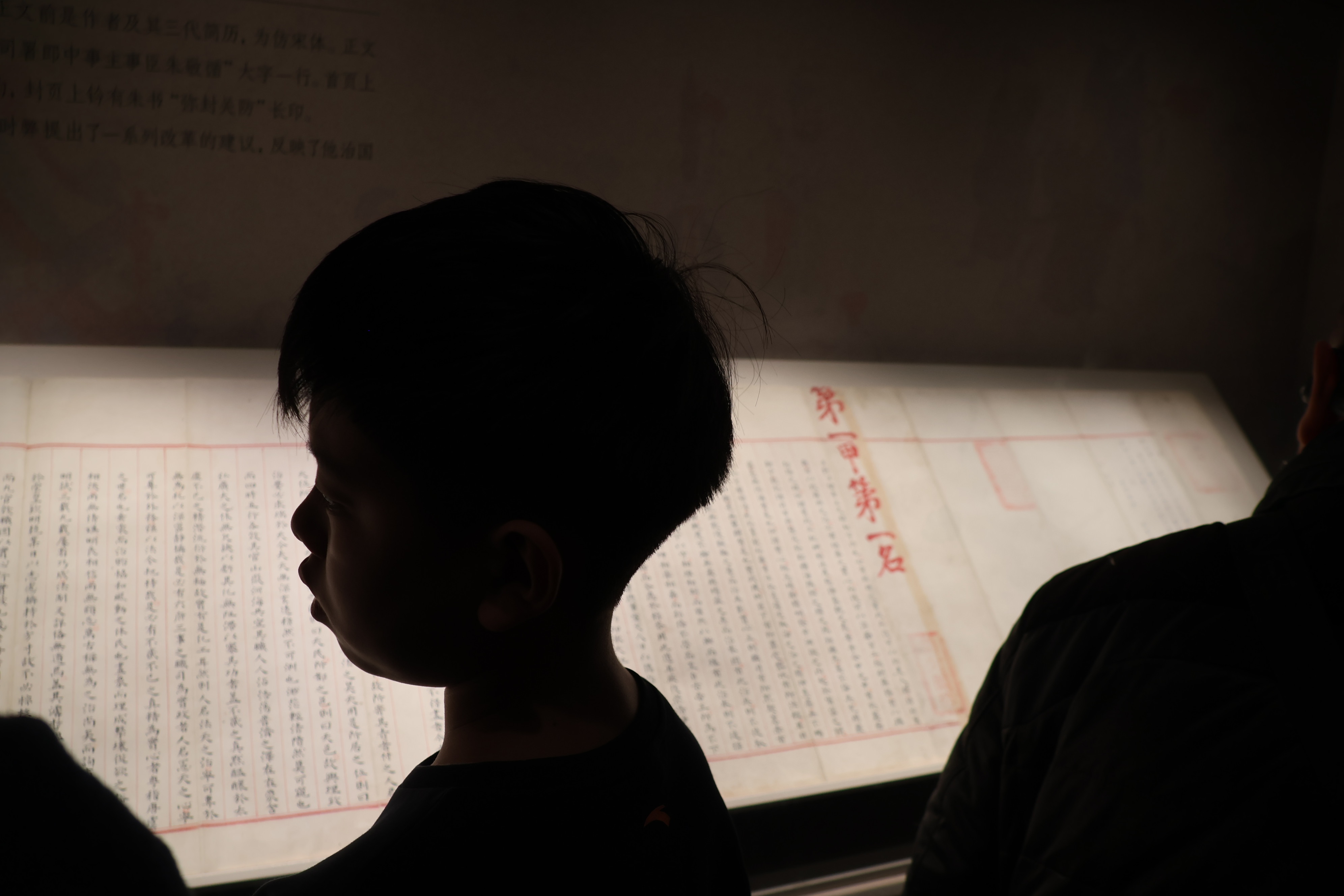 赵秉忠“第一甲第一名”状元卷展柜前,小朋友看得入迷。都亚男摄