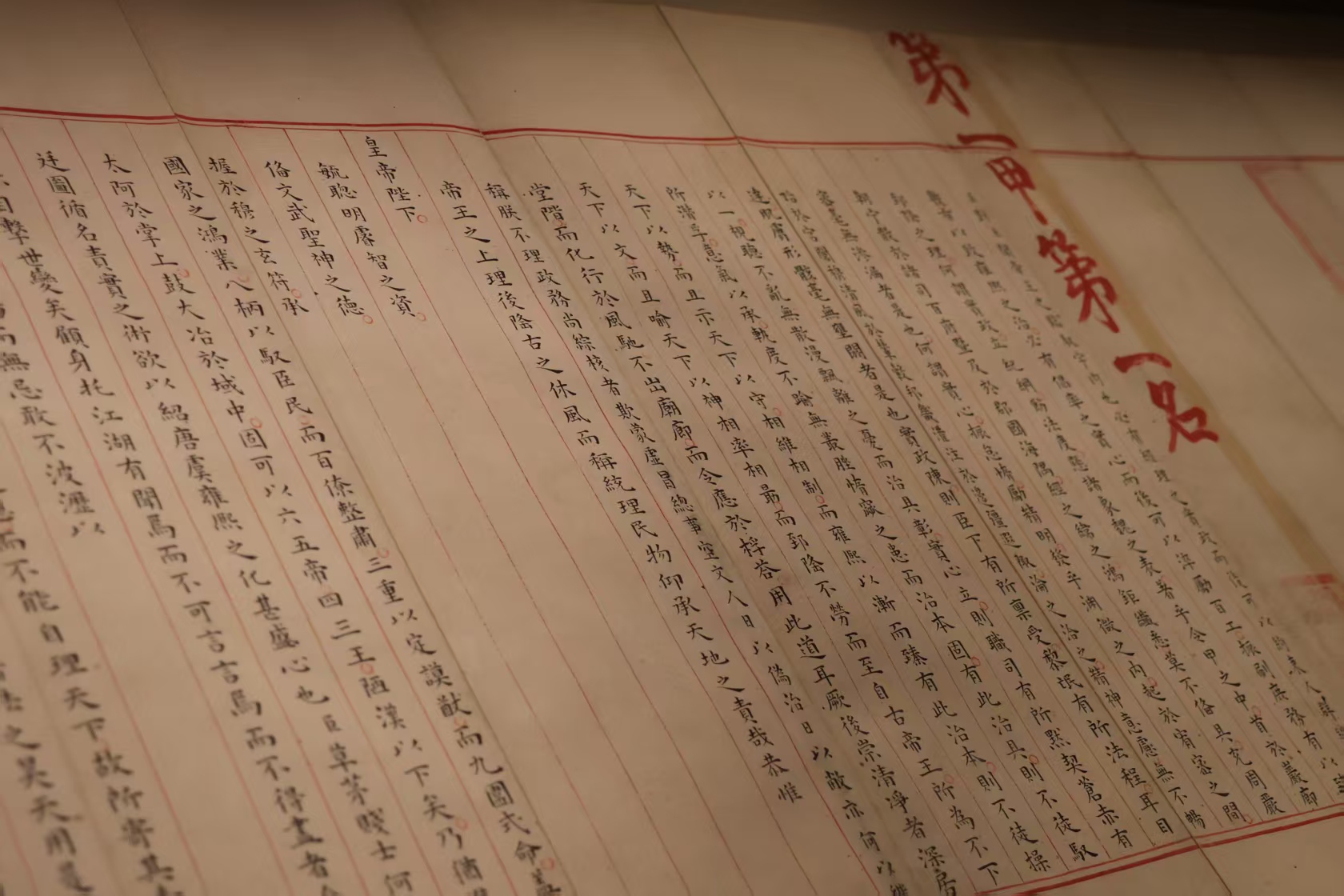 赵秉忠“第一甲第一名”状元卷字迹工整,看着2400多字的殿试卷,不禁遐想当状元不光是考验文笔、方略,还要考一考殿前不惊的胆气。都亚男摄