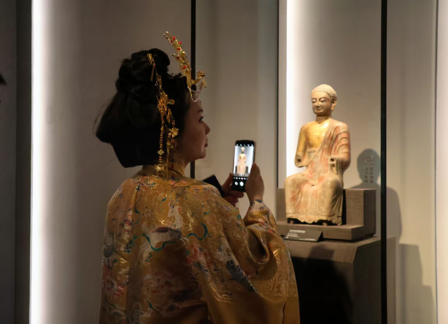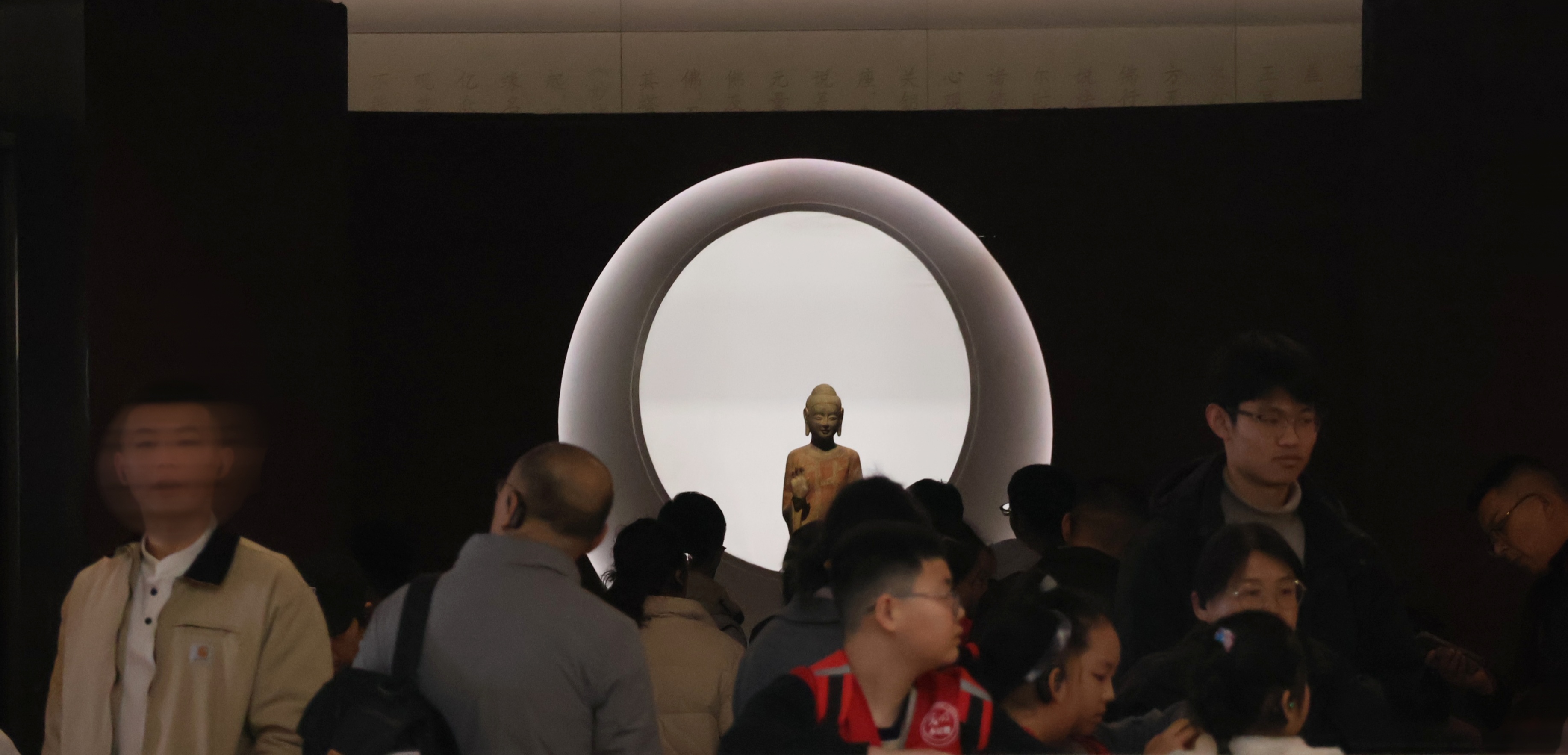 二楼“状元卷”前摩肩接踵,有挤进重围的小朋友看“状元卷”念着赵秉忠的治国方略。四楼是青州龙兴寺佛造像的展厅,比起楼下,这里更是安检大姐描述的“人乌泱乌泱的”景象。佛像前一抹金黄色汉服妆造的身影很惹眼,拍下照片我上前问道,原来是一位从辽宁抚顺专程来青州的妈妈,带着儿子来打卡“青州微笑”。她说,很治愈。