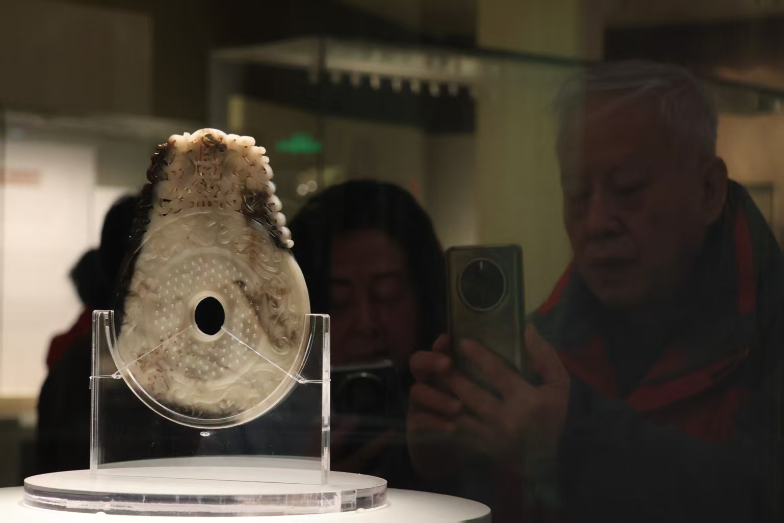 青州博物馆的镇馆之宝之一东汉宜子孙玉壁,一位老人正在拍照,玉器中间有透雕的篆书“宜子孙”三字,寓意“子子孙孙 宜室宜家”。都亚男摄