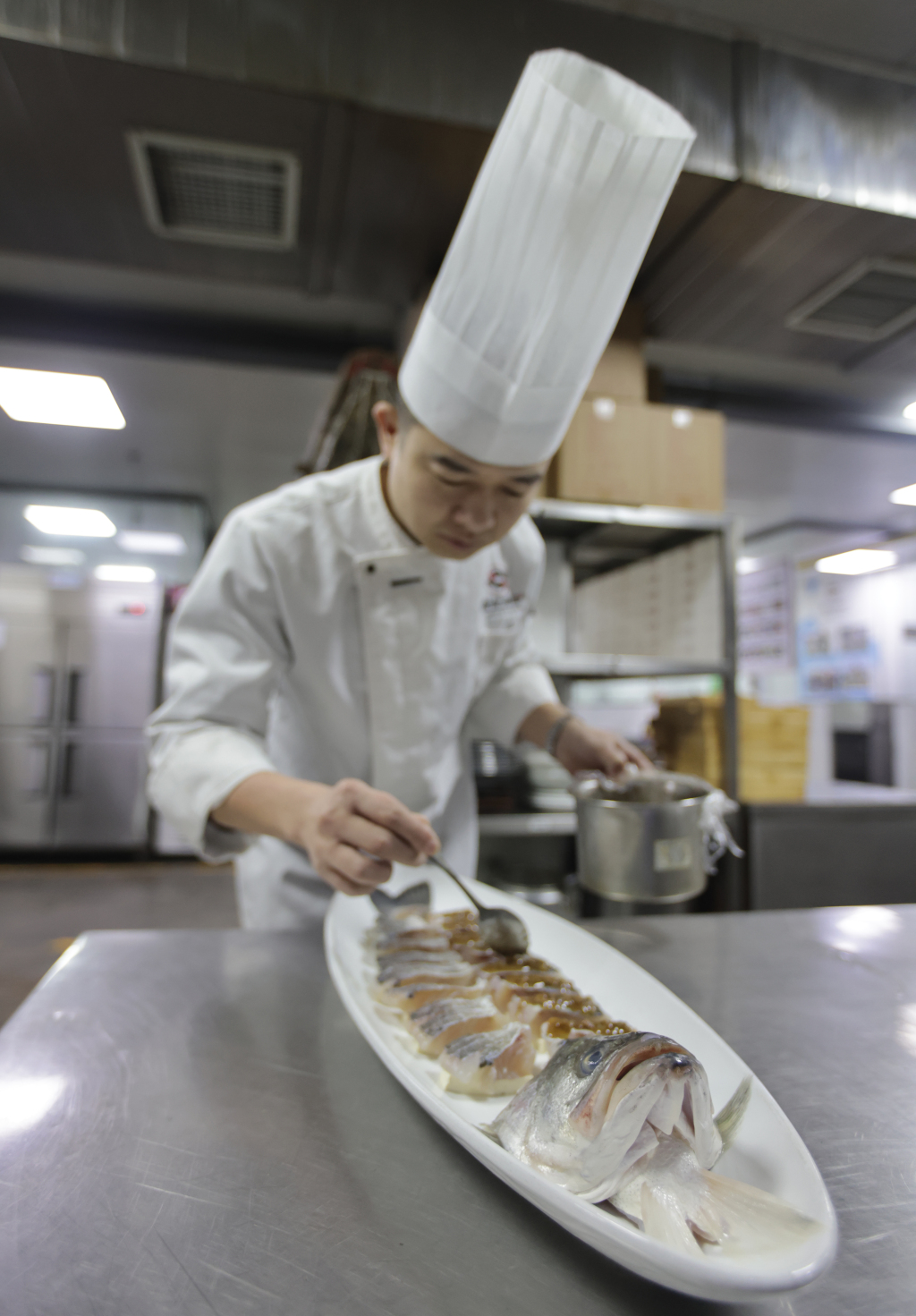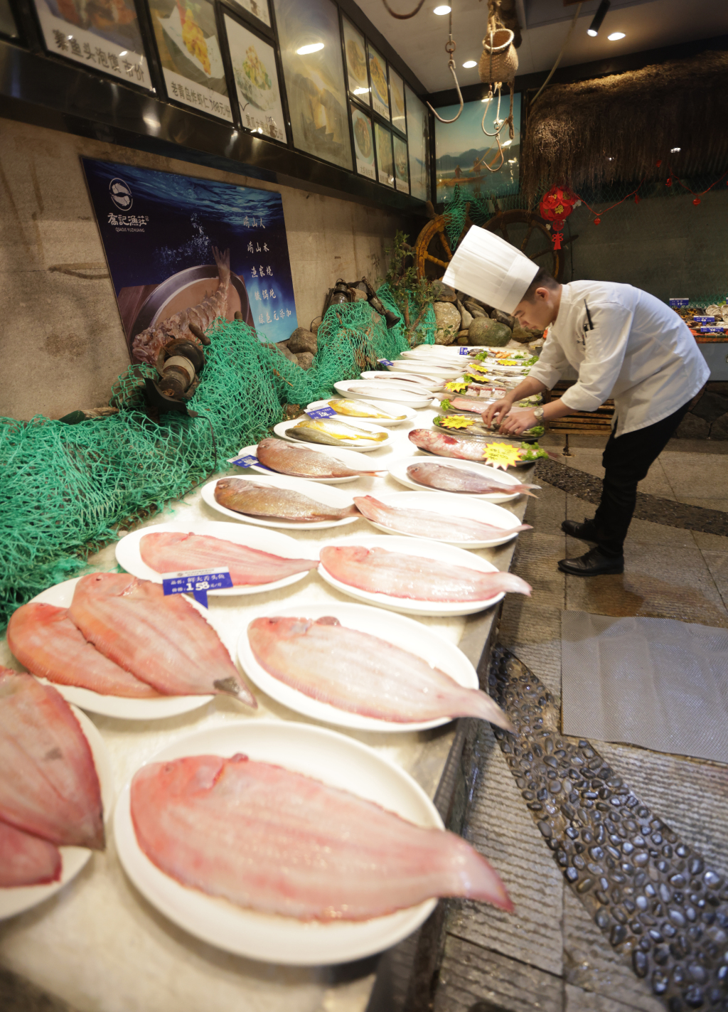 厨师长在整理除夕夜当晚用的鲜鱼