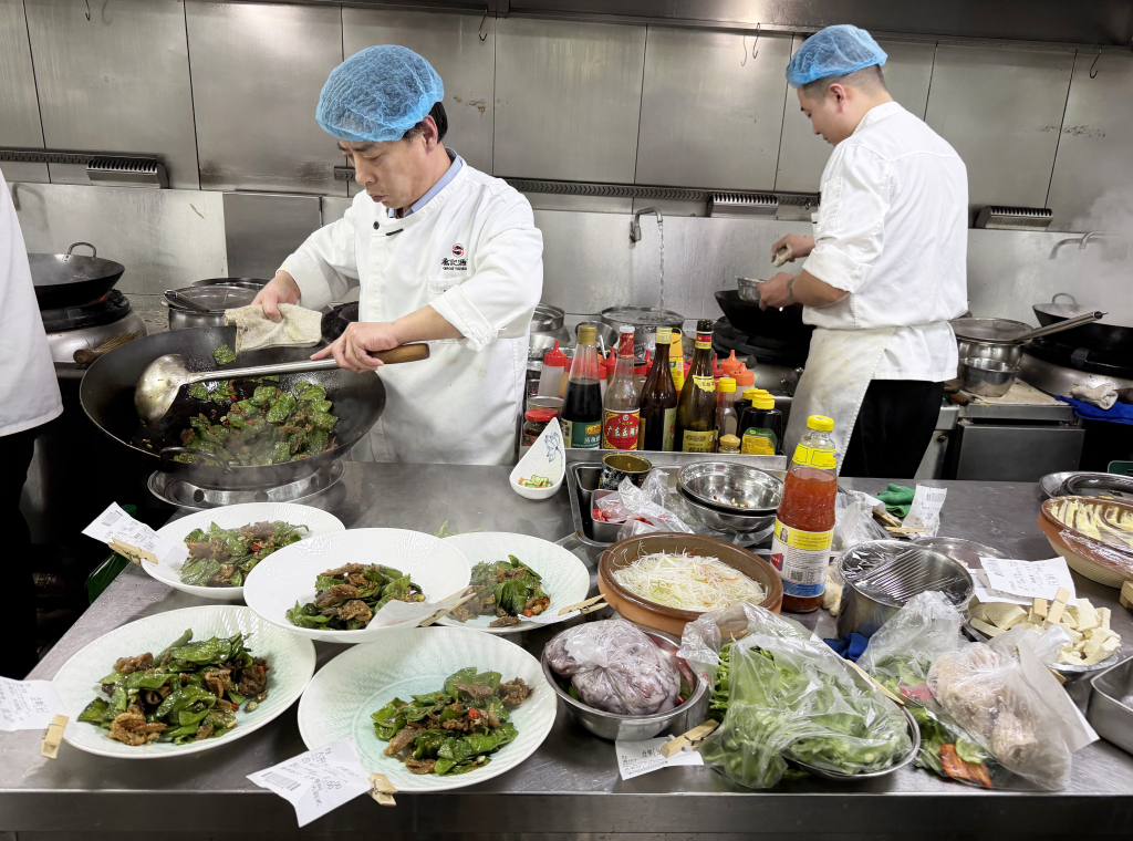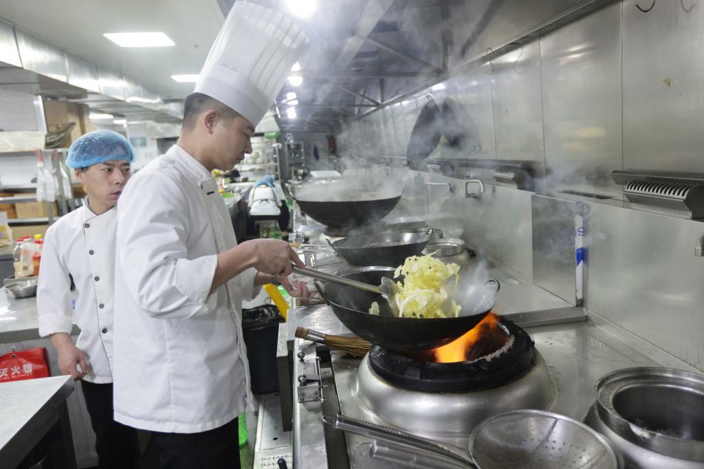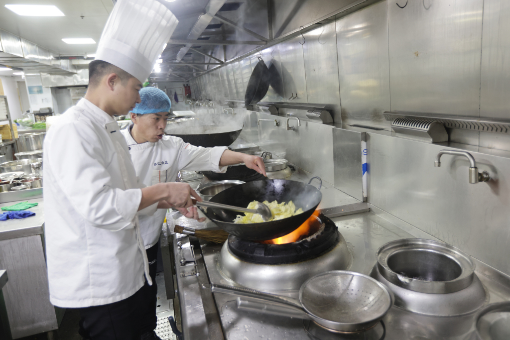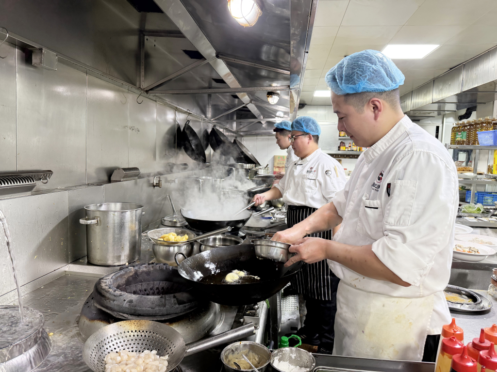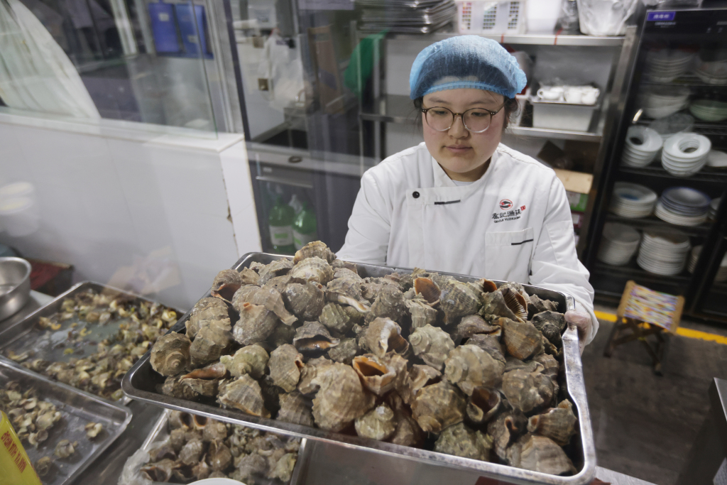 另一边,饭店后厨同样忙碌不停。厨师长彭庆明带领团队全力备战年夜饭,后厨里热火朝天、井然有序。为保障食客吃得尽兴、吃得新鲜,后厨提前备足食材:仅凉菜所用海螺就准备了 40 斤,寓意年年有余的舌头鱼备有 80 条,各类新鲜海鲜一应俱全。豆腐、青菜等家常吉祥菜,更是年夜饭桌上的必点美味。