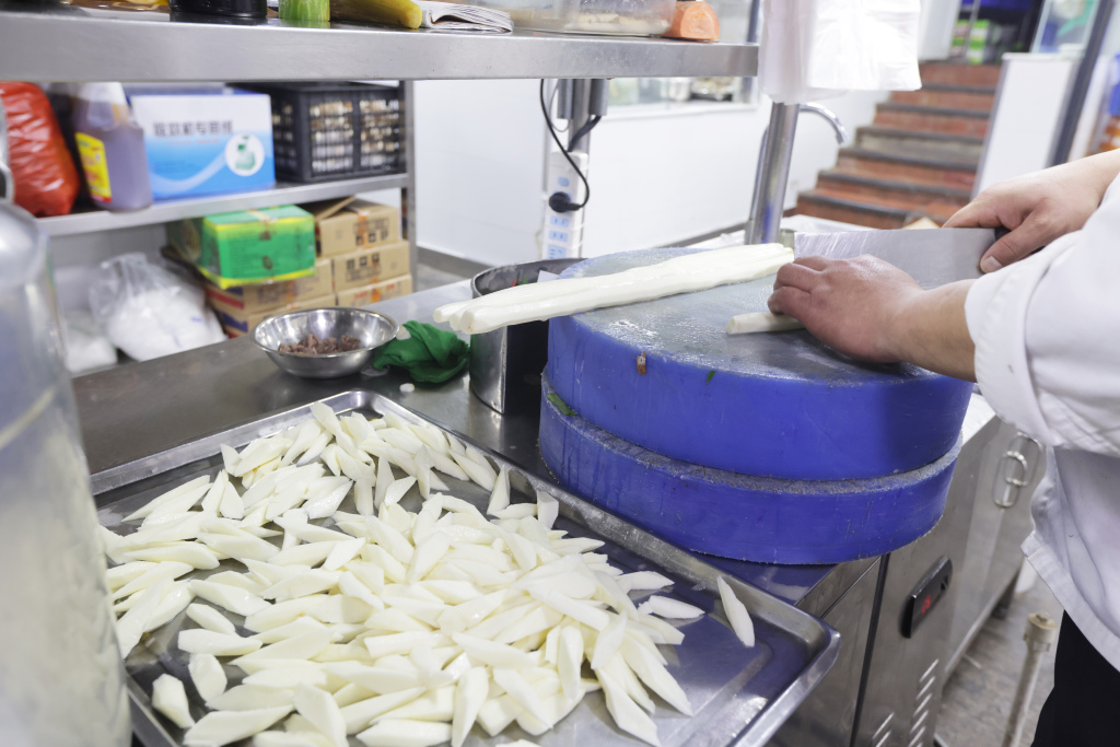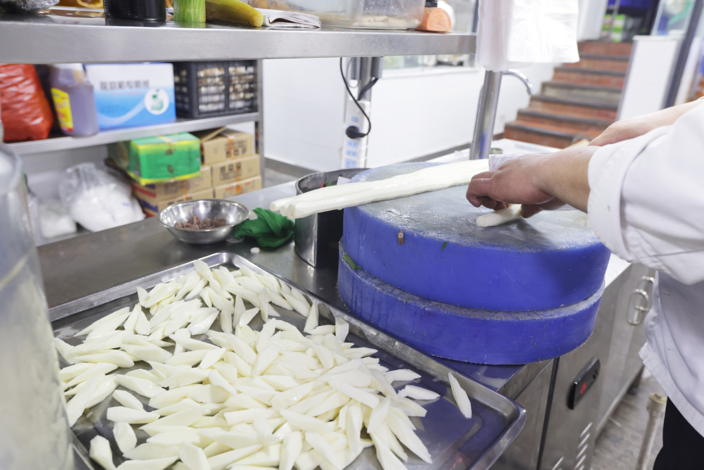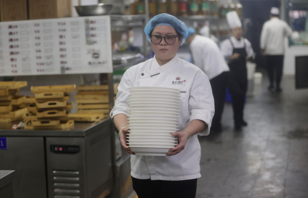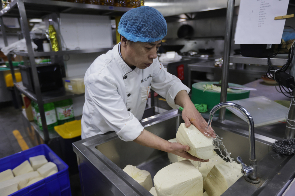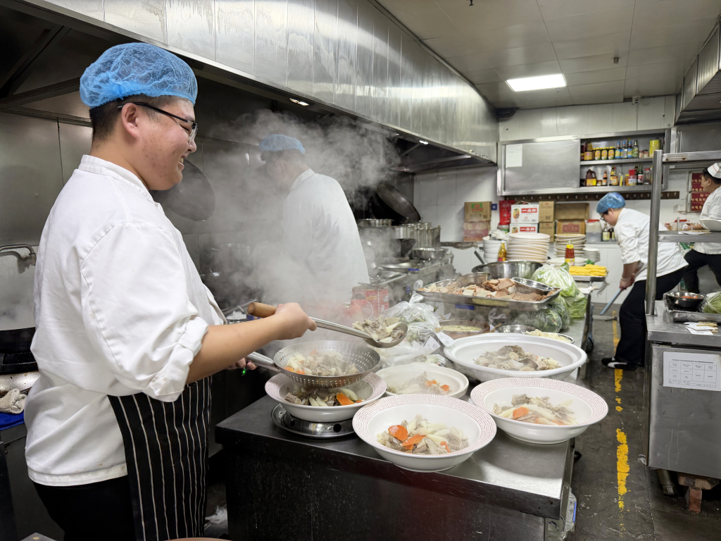 另一边,饭店后厨同样忙碌不停。厨师长彭庆明带领团队全力备战年夜饭,后厨里热火朝天、井然有序。为保障食客吃得尽兴、吃得新鲜,后厨提前备足食材:仅凉菜所用海螺就准备了 40 斤,寓意年年有余的舌头鱼备有 80 条,各类新鲜海鲜一应俱全。豆腐、青菜等家常吉祥菜,更是年夜饭桌上的必点美味。
