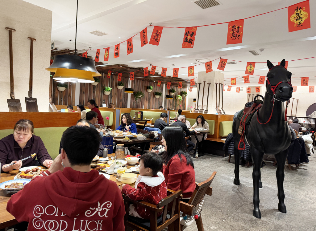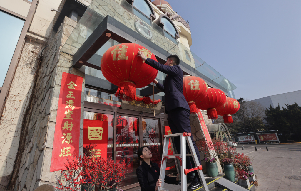 饭店门前年味十足,大红灯笼高高挂起