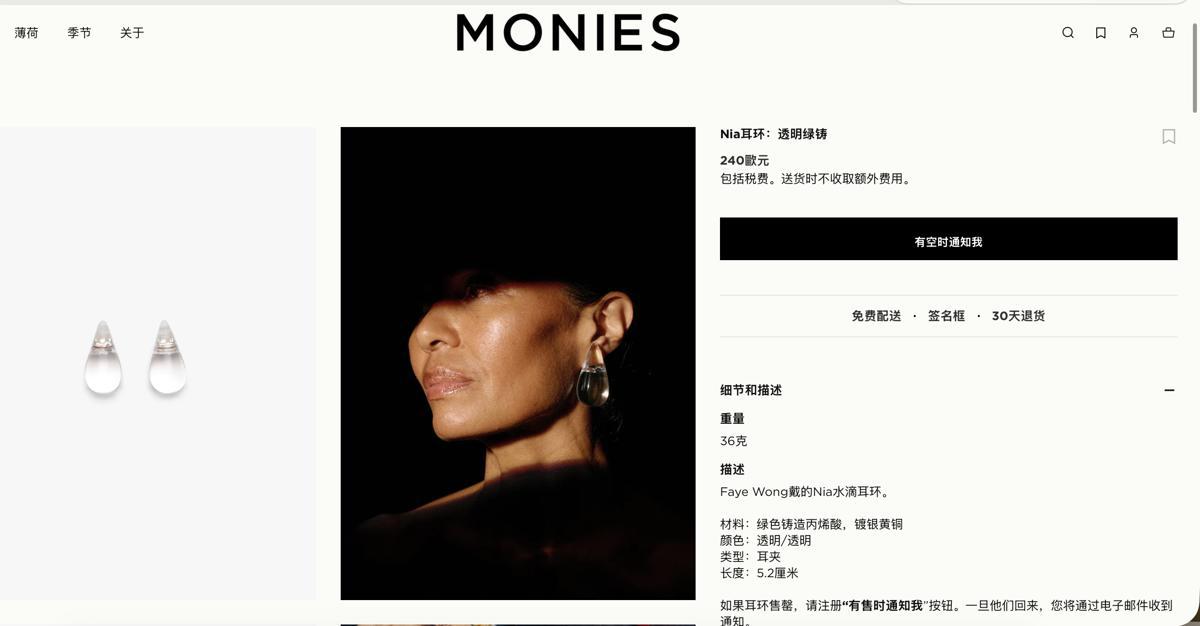 极目新闻记者注意到,17日凌晨,有网友发现,该耳环品牌已连夜修改产品信息。记者登录该品牌官网,看到在耳环的产品描述一栏,信息已更改为“Faye Wong(王菲英文名)戴的Nia水滴耳环”。