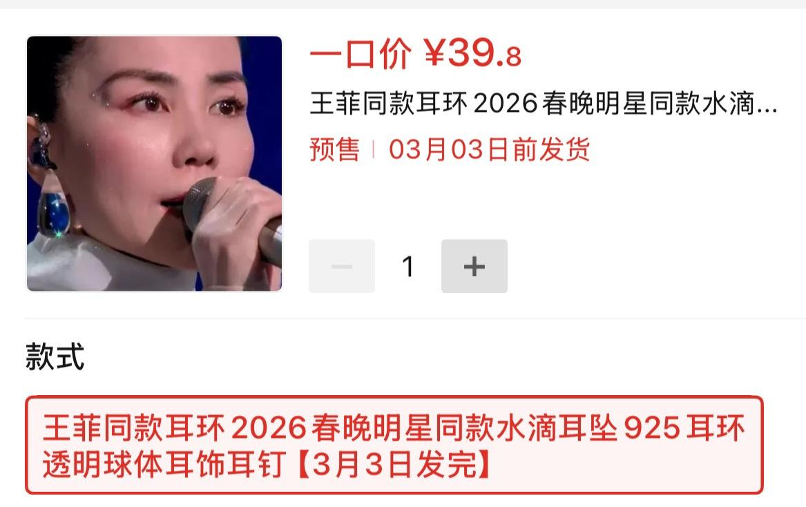 17日中午,记者注意到,已有电商平台上架王菲同款耳环,售价为39.8元。不过该产品为预售产品,预计3月3日前发货。