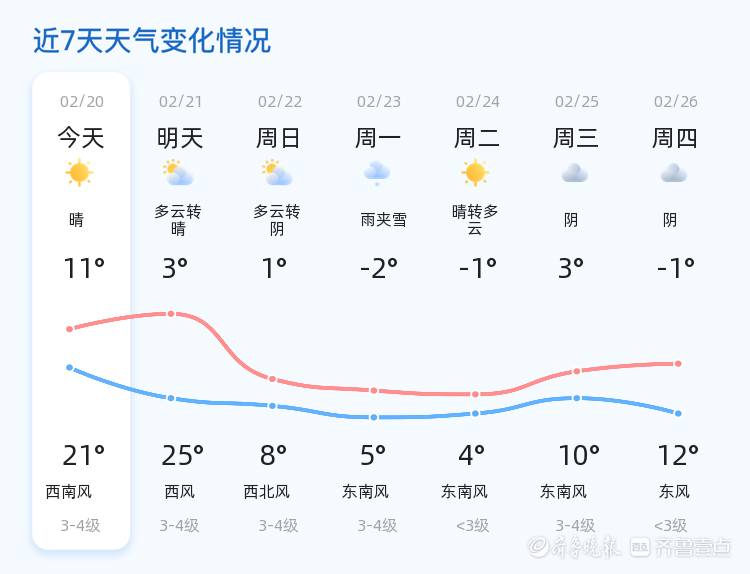 今天是2月20日,正月初四,潍坊市迎来晴朗的一天。全市范围内天气晴朗,温度适中,最高气温21℃,最低气温11℃,南风1级,空气湿度36%。整体天气状况良好,适合户外活动。