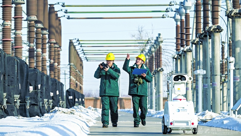 2月17日,国网昌吉供电公司变电运维中心值班员和巡检机器人在220千伏长宁变电站巡检。何龙摄