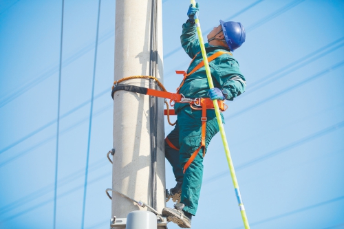 刘培峰立刻穿戴好安全攀登设备,将脚扣稳稳卡住线杆,一步步往上攀登,脚扣和线杆碰撞发出的“咔咔”声,回荡在空空的街道上。爬到距离杆顶4米左右,刘培峰用绝缘杆对鸟巢进行清理。“不是很容易,鸟巢搭得太结实,看着还挺靠近高压线,只在一侧清理恐怕不行。”张建成看着无人机屏幕说。随着刘培峰手中的绝缘杆在电线杆上下穿梭,鸟巢的树枝掉落在他的安全帽上和身上,那一抹蓝绿色的工作服,在高空中和蓝天融为一体。