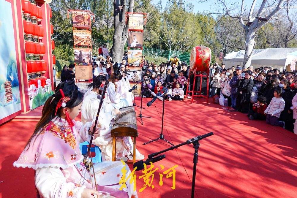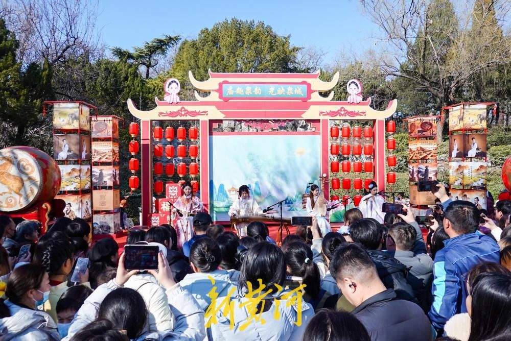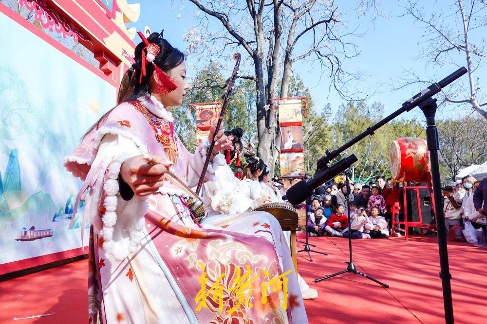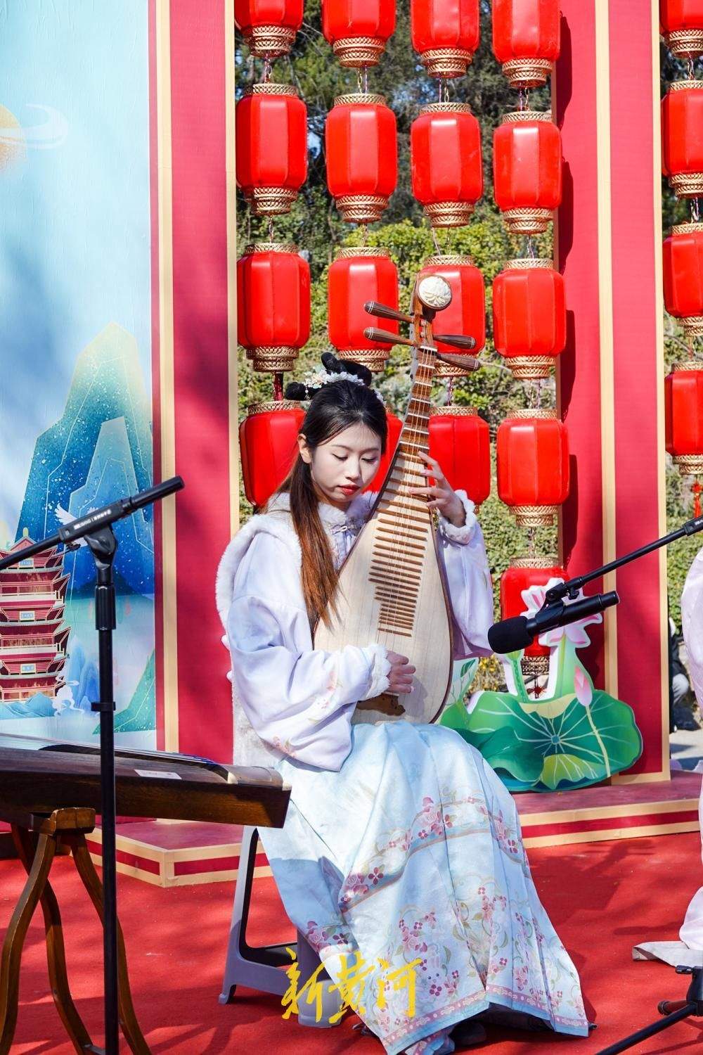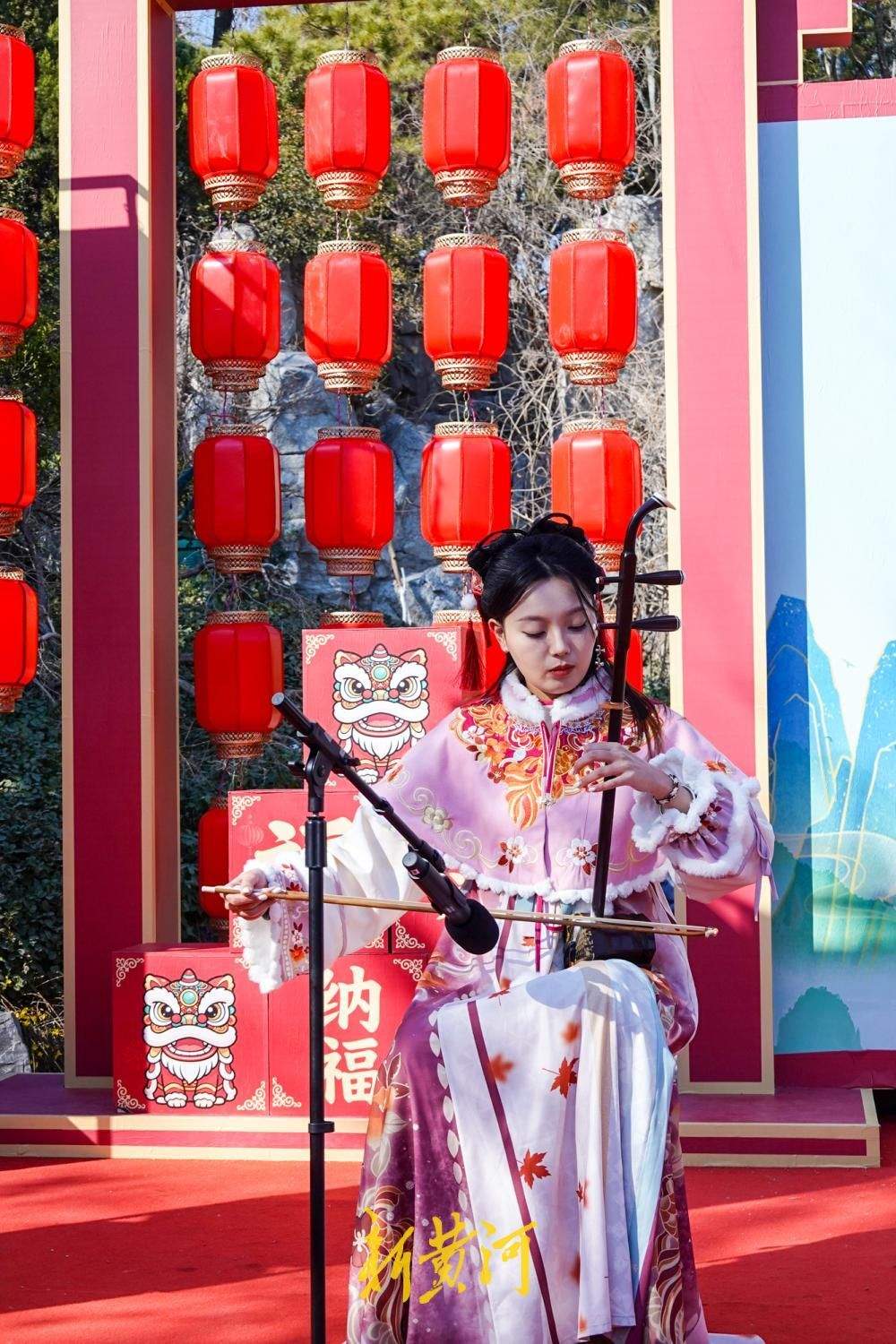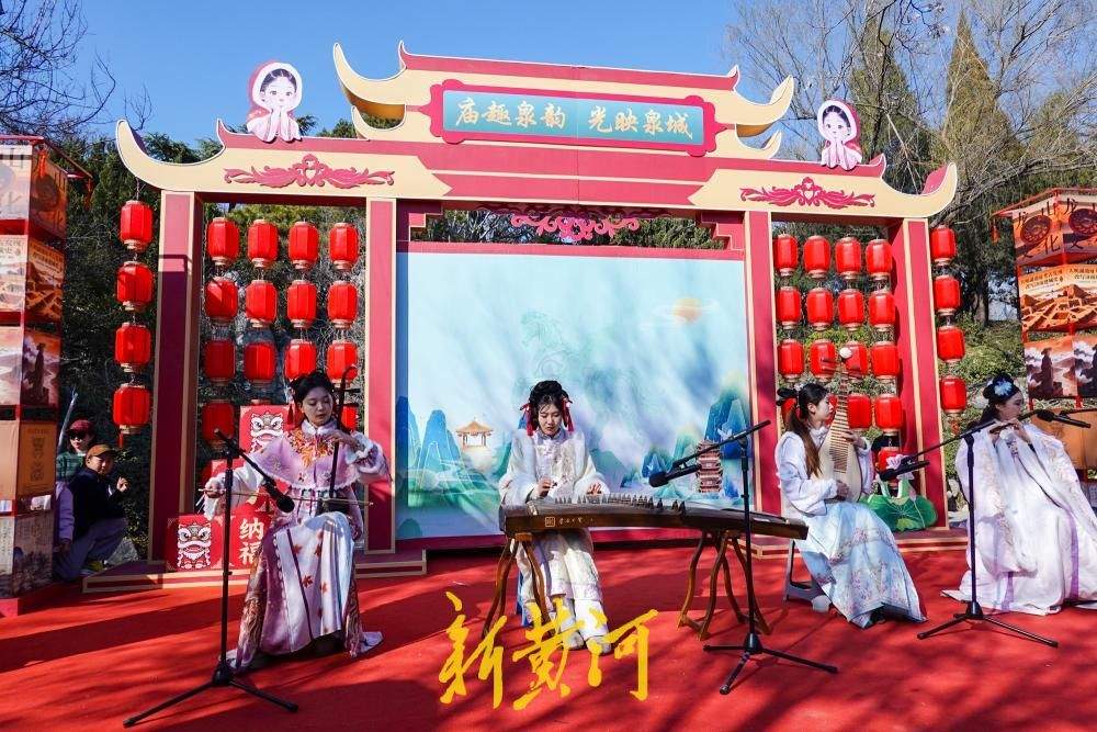 庙会期间,主舞台的表演更是精彩纷呈,一支由身着华丽汉服的少女们组成的国风乐队惊艳亮相。她们轻抚古筝、琵琶,吹奏竹笛,一曲曲悠扬婉转的传统民乐流淌而出,为喧闹的庙会增添了一抹典雅与宁静。乐声与泉韵交融,古装与佳节辉映,让游客在沉浸式的体验中,深深感受到了传统中国年的独特喜庆氛围与深厚文化底蕴。