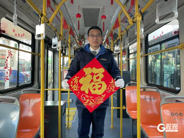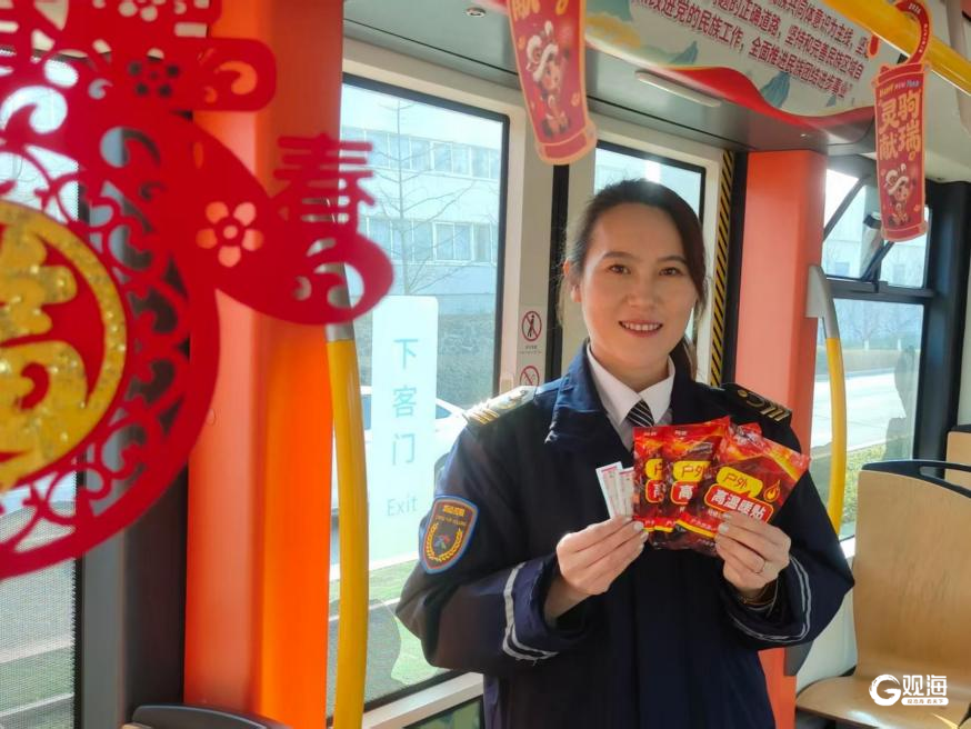 “新年快乐,欢迎乘坐青岛有轨电车。”轨道巴士乘务员泮茜茜已是第五个春节坚守在岗位上。今年,细心的她提前用中国结、窗花装饰车厢,让乘客一上车就感受到浓浓年味。
