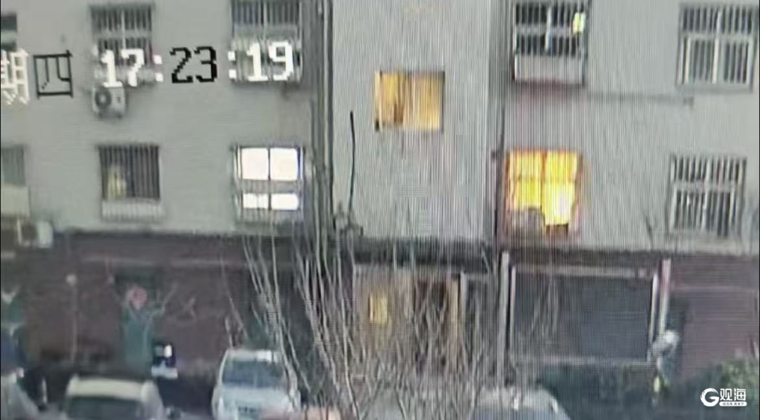 社区居民楼火灾的监控截图:右侧明黄色的房间为起火房间。