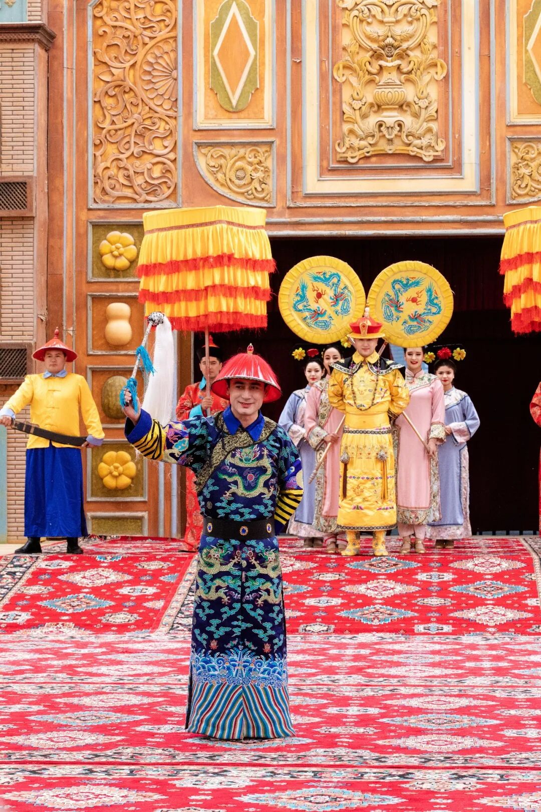 开城仪式刚结束,他来不及休整,便匆匆卸下头饰,赶往香妃园。12:30,《欢乐香妃》开演。他换上管家服,背微驼,捋着假胡须踱步上台;半小时后,再次出场时,已是尖嗓细步的“太监”。台下观众不曾察觉,同一个身影,在同一台剧里,一人分饰两角。