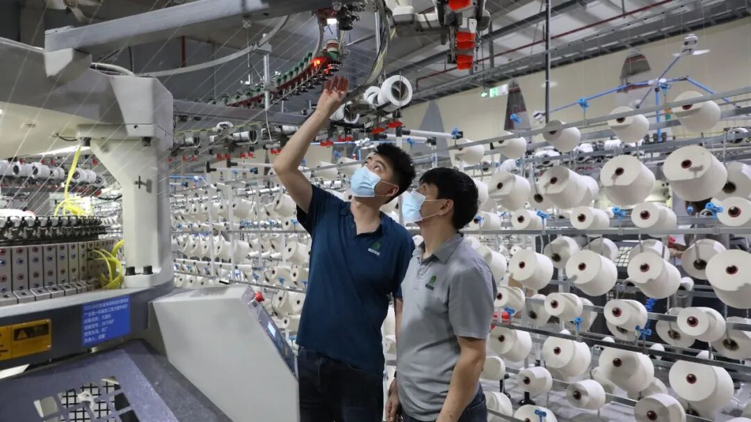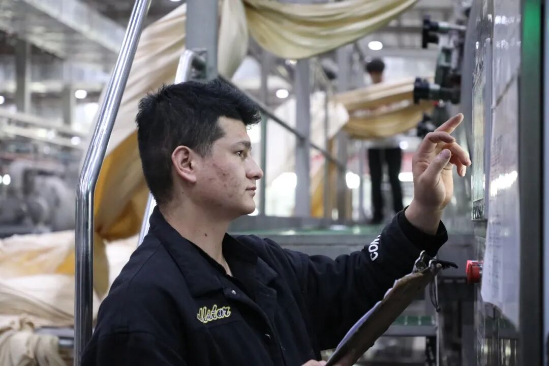在巴楚县某染织科技公司生产车间内,工人正在检查设备、核对数据。喀什地区融媒体中心实习记者尉旭升 摄